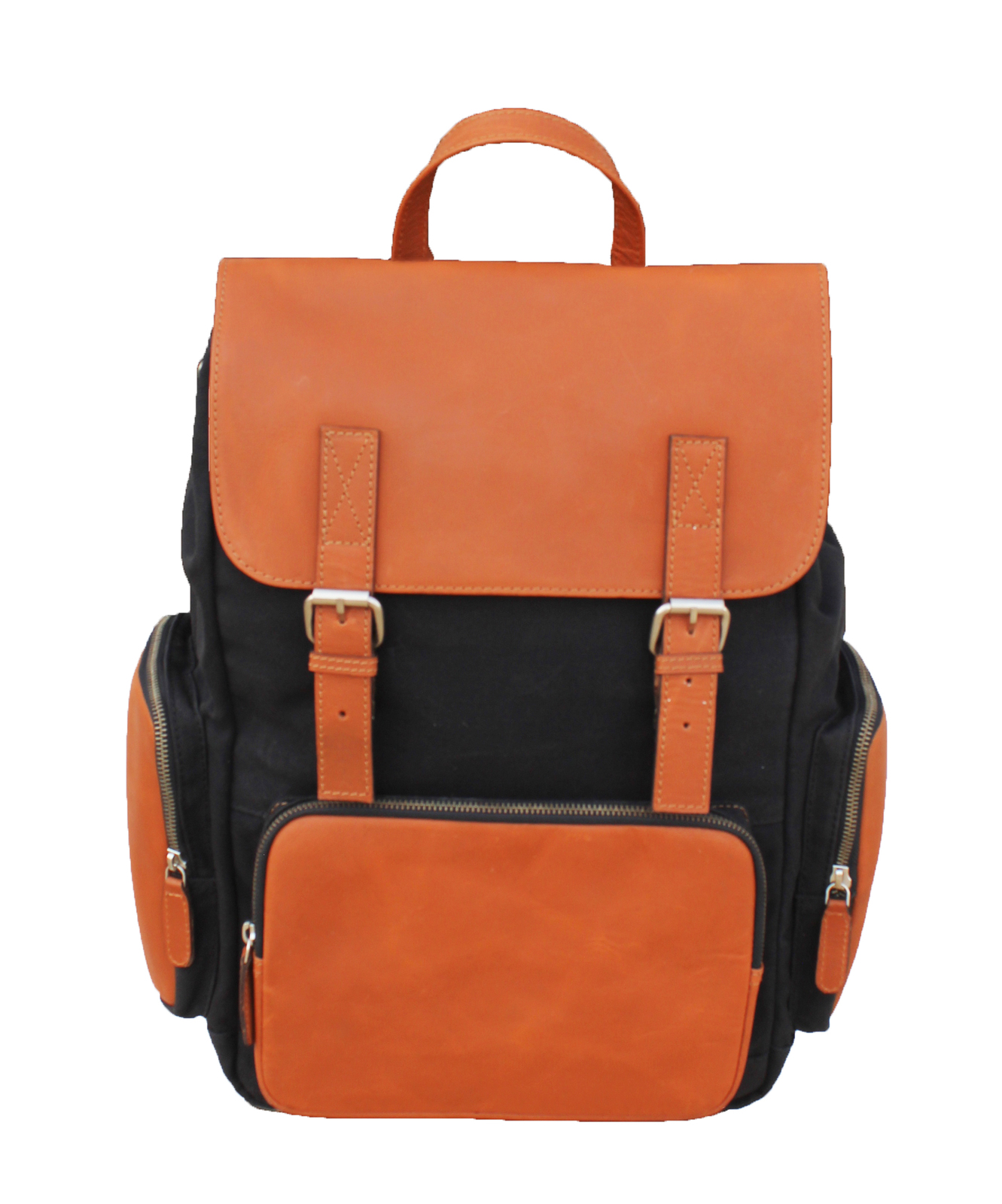 Challenger versatile bag hand crafted from lightweight, yet rugged canvas with full-grain crushed tan leather reinforced accents. This multipurpose bag is ideal for work, traveling, weekend trips, hiking, or daypacking. Conveniently sized top loading roomy bag fits most airline overhead bins for a great carry-on option. The main compartments features a dual button press closure with side buttons to keep everything inside. Bag opens wide to easily store, and organize belongings. The fully lined interior features a padded laptop compartment, one zippered side pocket, and two open compartments for additional storage. Adjustable shoulder straps come padded for comfort. On the exterior there is one zippered pocket, and two small side zippered pockets. Bag measures 14" L x 5" W x 17" H providing plenty of room for all of your essentials.
