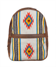 Challenger western versatile bag made from supple genuine full-grain distressed brown leather to endure everyday use. Bag comes accented with a unique handwoven saddle rug multicolor pattern front. This lightweight multipurpose bag is ideal for work, traveling, weekend trips, hiking, or daypacking. Conveniently sized roomy bag fits most airline overhead bins for a great carry-on option. Inside there is one side zippered pocket, and two open compartment for organized storage. Washable lining allows for easy cleaning in case of accidental spills. Adjustable shoulder straps come padded for comfort. Available in a variety of unique woven designs! Bag measures 11" L x 3" W x 15" H providing plenty of room for all of your daily essentials.
