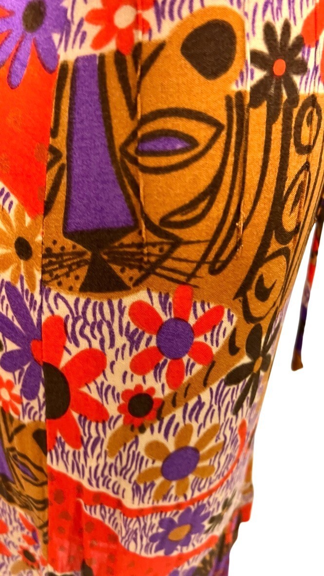 This light as a feather vintage silk print is a very form-fitting simple dress with a half button placket and a smooth transition to the skirt, which is micro pleated in 2 segments. Long slim-fitting sleeves. LOVE the Mod, Ultra 70s Stylized Lion Print! The back is all one piece. This has no label however it came from an estate where all of the clothing and accessories were designer. It is of material exactly like a top I have with a BESSI label.