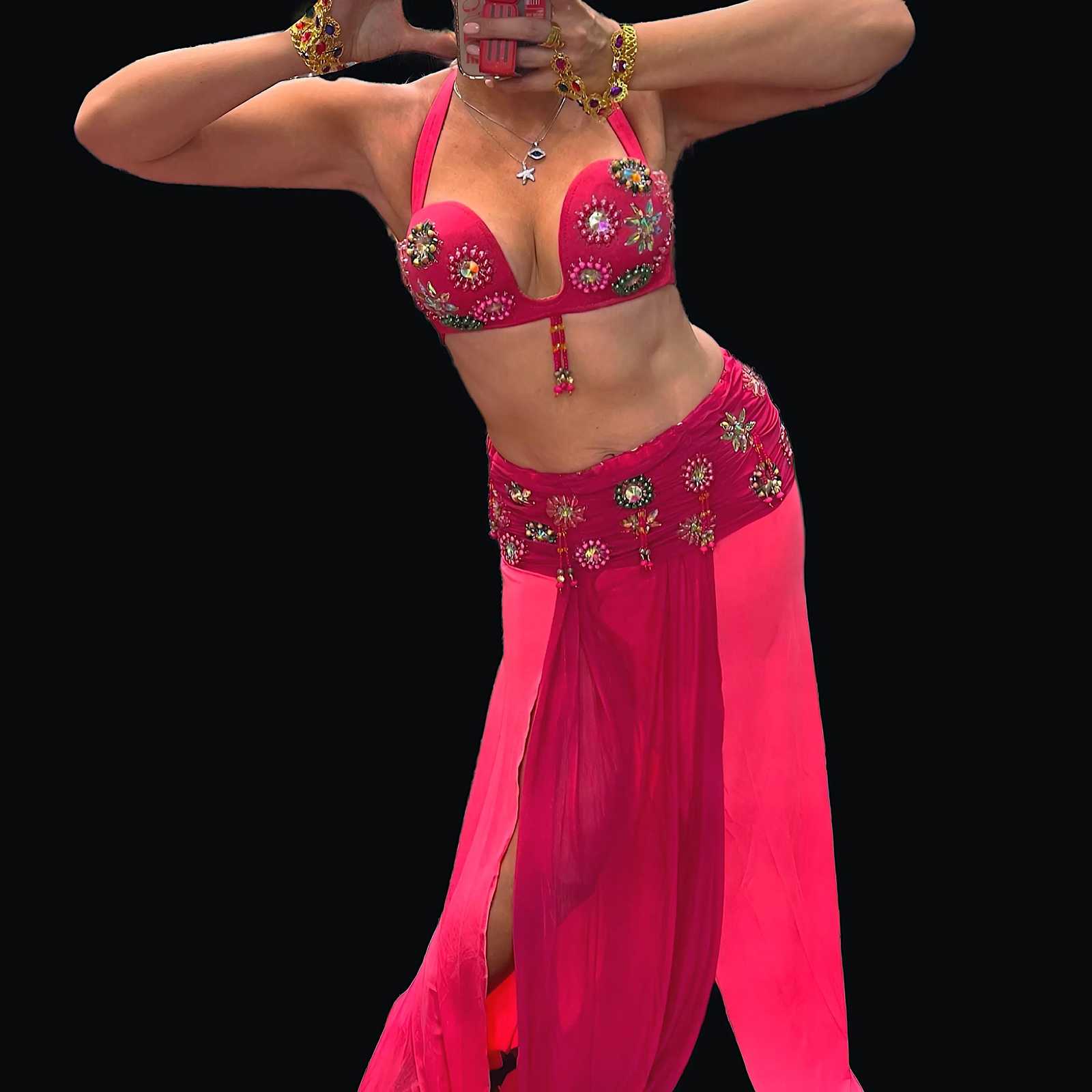 Pink Lace Belly Dance Costume: Handmade Crystal Embroidery Top & Skirt