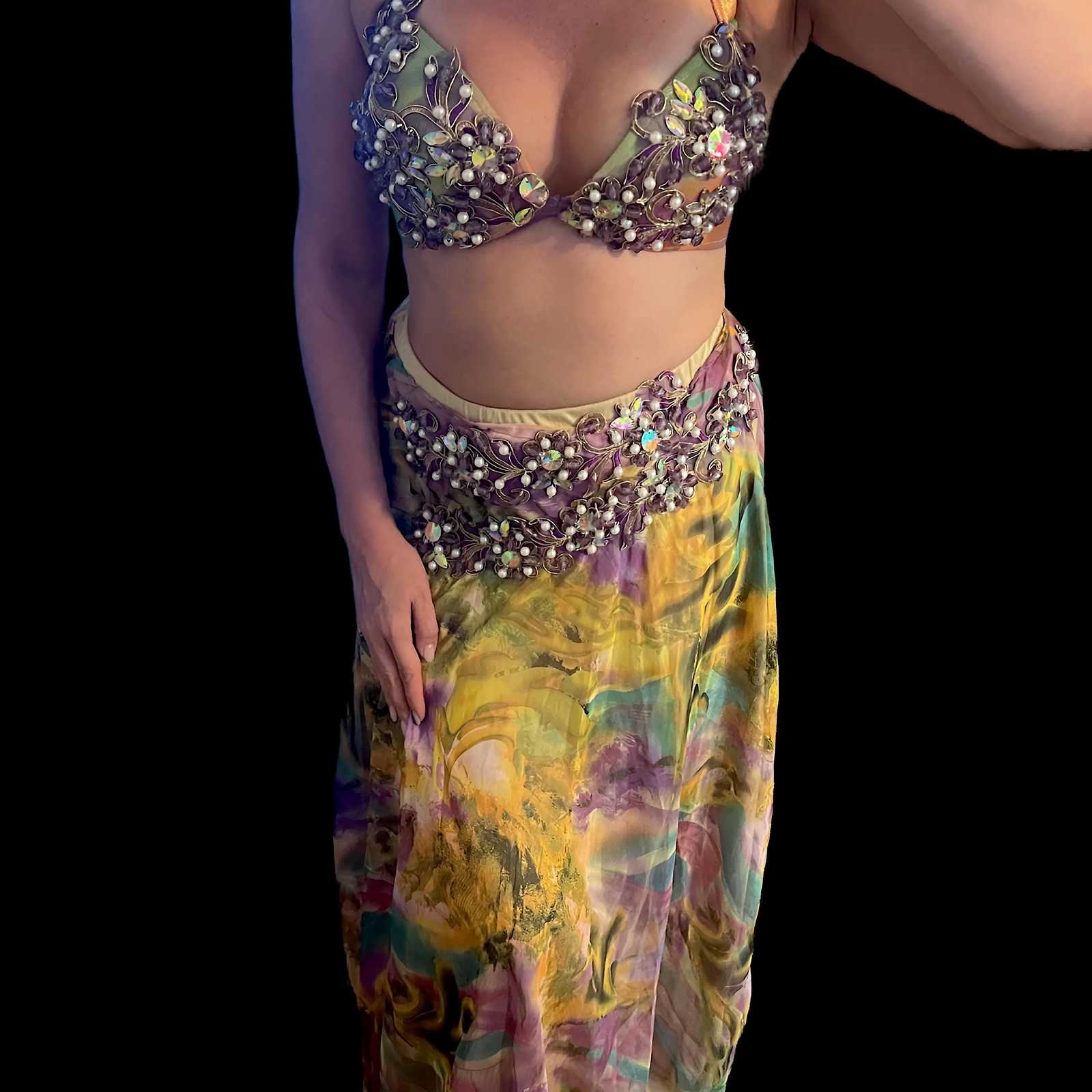 Not only is this costume a feast for the eyes, but it also embodies the spirit of celebration and artistry inherent in belly dance. The hand-sewn beads glisten brilliantly, adding an extra touch of glamour that is bound to make heads turn. With its vibrant colors and luxurious materials, this dress is not just a costume; it's an experience.