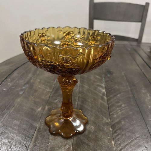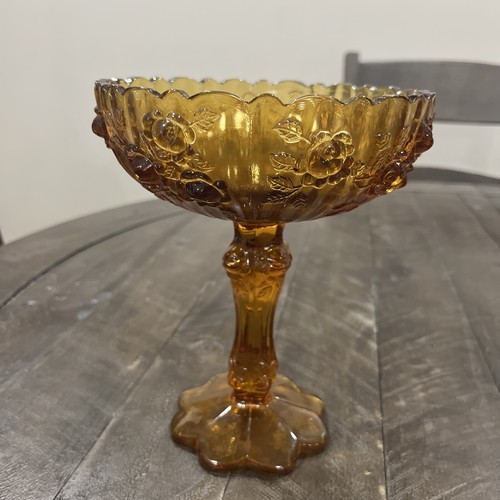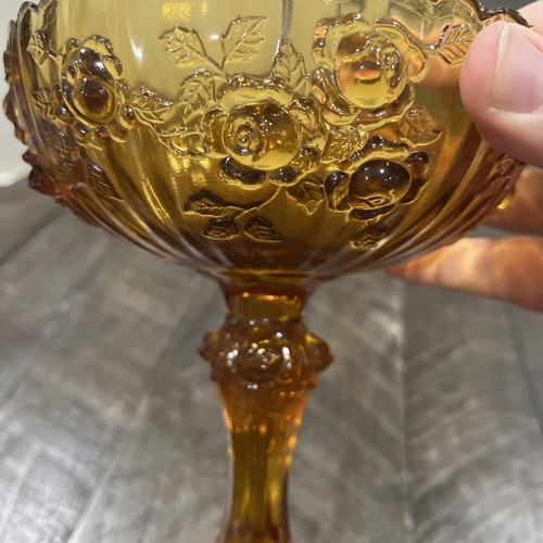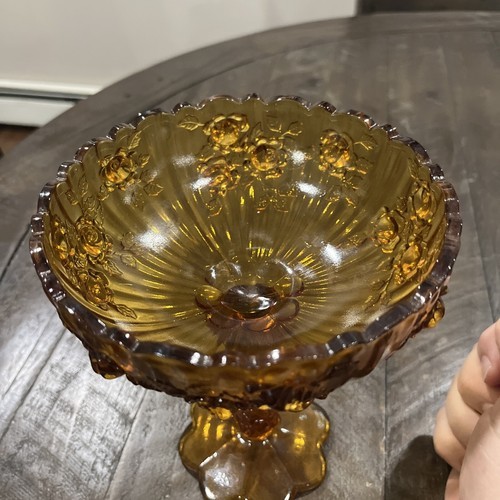 Vintage Fenton Amber Honey Glass Compote Cabbage Rose Pedestal Candy Relish