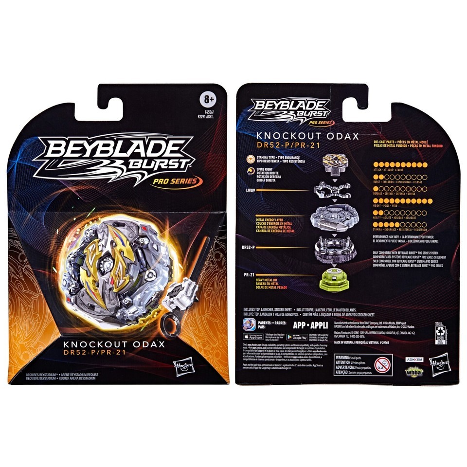 This Starter Pack includes 1 Beyblade Burst Pro Series right-spin launcher, sticker sheet, and 1 right-spin competitive battling top: Knockout Odax DR52-P PR-21. Top includes die-cast metal parts for a heavy weight. Knockout Odax stamina type top features metal in the Energy Layer base and Performance Tip for a heavy metal hit.