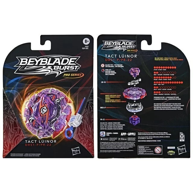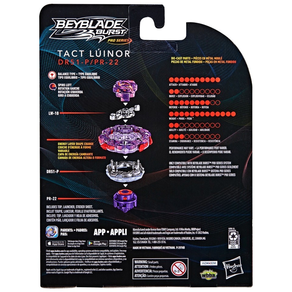This Starter Pack includes 1 Beyblade Burst Pro Series left-spin launcher, sticker sheet, and 1 left-spin competitive battling top: Tact Lúinor DR51-P PR-22. Top includes die-cast metal parts for a heavy weight. Tact Lúinor balance type top features a changing number of rubber blades on the Energy Layer depending on which layer weight is used.