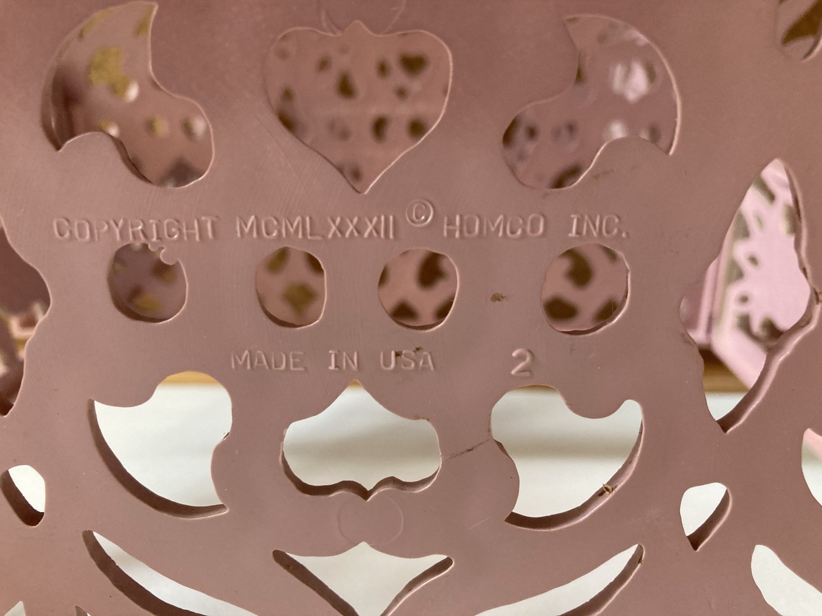Vintage Homeco Pink Filigree, lacy, 3 Shelf Wall Shelf. This is a plastic shelf that has little dimples mimicking a hand carved piece of wood.