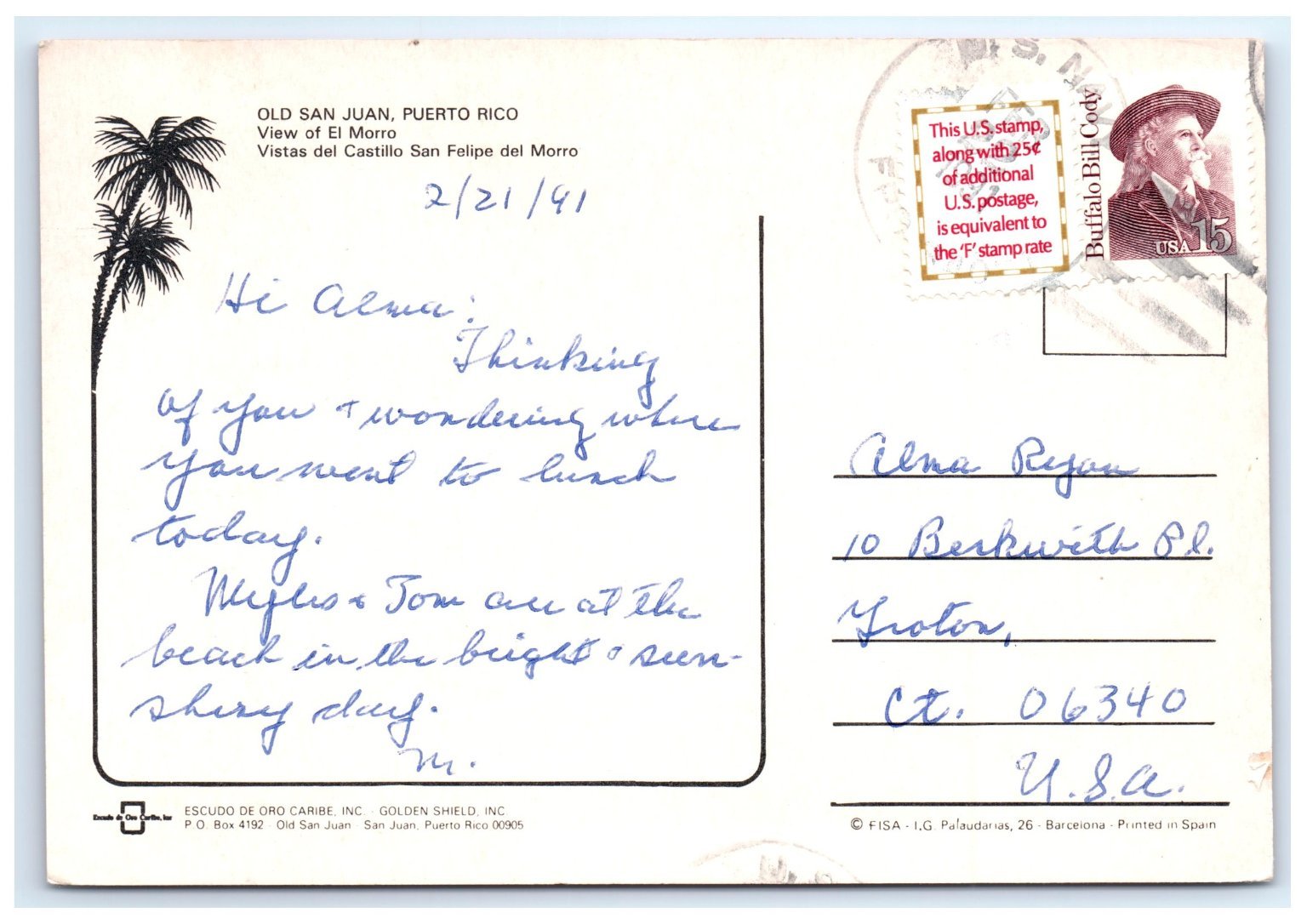 Produced by Escudo de Oro Caribe, Inc. and printed in Spain by FISA - I.G. Palaudarias, this original postcard includes detailed imagery of El Morro's imposing fortifications and lively tourist scenes. The back bears a handwritten message dated 2/21/1971, complete with a 15-cent Buffalo Bill U.S. postage stamp and clear postal markings, adding to its collectible charm. Ideal for collectors of Puerto Rican memorabilia, historical landmarks, or vintage travel ephemera, this postcard offers a colorful glimpse into one of the Caribbean's most celebrated sites.