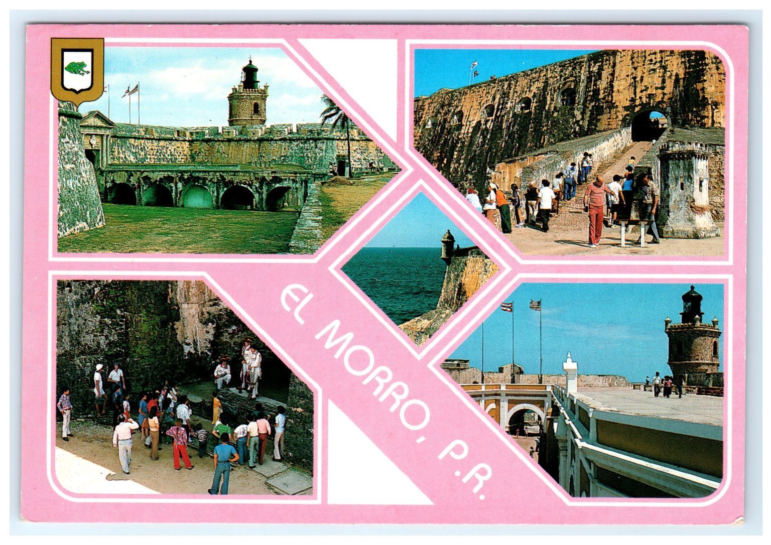 This vibrant vintage postcard showcases multiple stunning views of El Morro, the iconic Castillo San Felipe del Morro in Old San Juan, Puerto Rico. Featuring colorful chrome lithograph printing on a continental 6x4 inch card, it captures the historic fortress's rugged stone walls, watchtowers, and scenic ocean backdrop. The postcard's pink border and multi-frame layout highlight various aspects of this UNESCO World Heritage site, inviting viewers to explore its architectural and cultural significance.