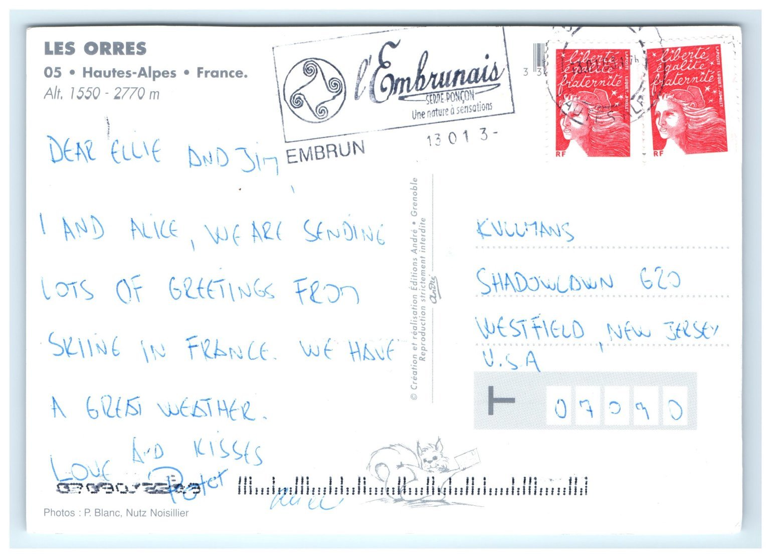 Les Orres, located at altitudes ranging from 1550 to 2770 meters, is renowned for its scenic mountain views and winter sports appeal. The postcard bears original French postage stamps and a handwritten message, adding to its authenticity and collectible value. Produced by Editions Andre in Grenoble, the card highlights the natural beauty and vibrant life of this popular alpine resort. Perfect for collectors or enthusiasts of vintage European travel memorabilia and ski culture.
