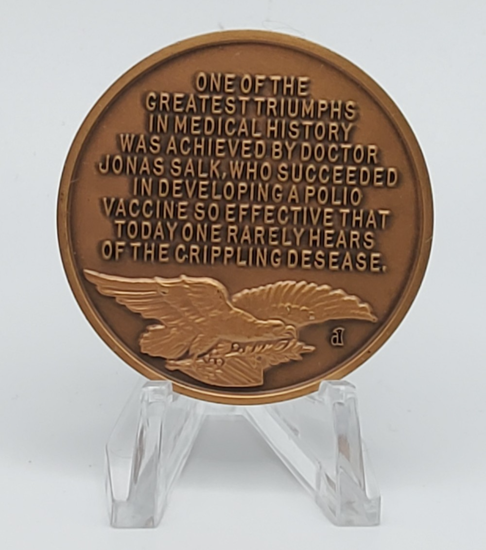 ? Historic Commemorative Medal ? This bronze medal honors Dr. Jonas Salk and his groundbreaking achievement in 1954: the development of the polio vaccine, one of the greatest triumphs in medical history.