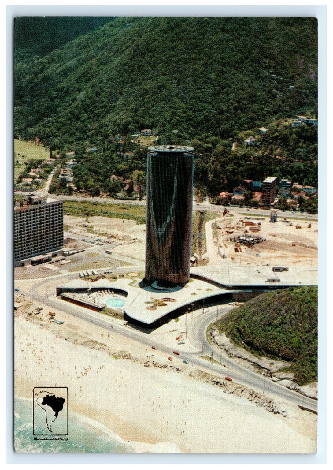 This vintage postcard features a stunning aerial lithograph image of the iconic Hotel Nacional in Rio de Janeiro, Brazil. Known for its distinctive cylindrical design, the hotel is prominently positioned against the lush green hills and the sandy coastline, capturing the unique blend of natural beauty and modern architecture typical of Rio. The postcard showcases vibrant colors and a glossy chrome finish, enhancing the visual appeal and durability of the printed image.