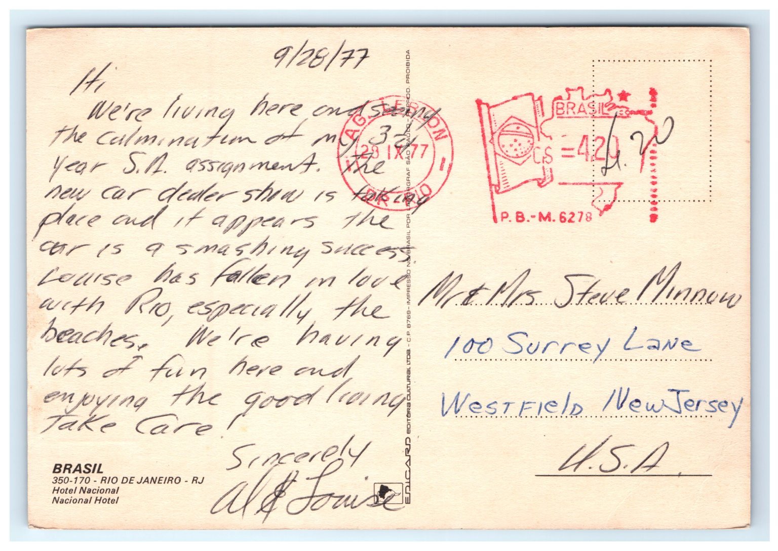 Published by Edicard, a well-known Brazilian postcard publisher, this original 6 x 4 inch lithograph postcard dates from 1977, as indicated by the handwritten message and postal marks. It was sent from Brazil to the United States, with a clear postmark dated September 28, 1977. The message offers a glimpse into the sender's South America experience, noting the local beaches and the car dealer show, adding a personal historical context. This collectible postcard is a great find for enthusiasts of travel memorabilia, Rio de Janeiro landmarks, or mid-20th century postcards.