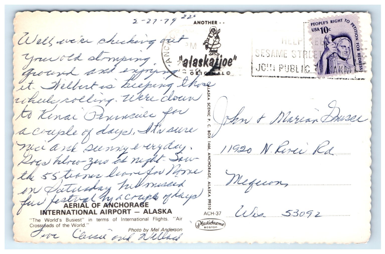 Postmarked in 1979, the reverse side includes a handwritten message and an authentic 10-cent USA stamp promoting the "People's Right to Petition for Redress." This piece offers a glimpse into Alaska's aviation history and is a collectible item for enthusiasts of vintage air travel memorabilia or Alaskan scenic views. The postcard's original printed text emphasizes Anchorage Airport's significance as the busiest international hub in terms of flights, making it a valuable keepsake for collectors and history buffs alike.
