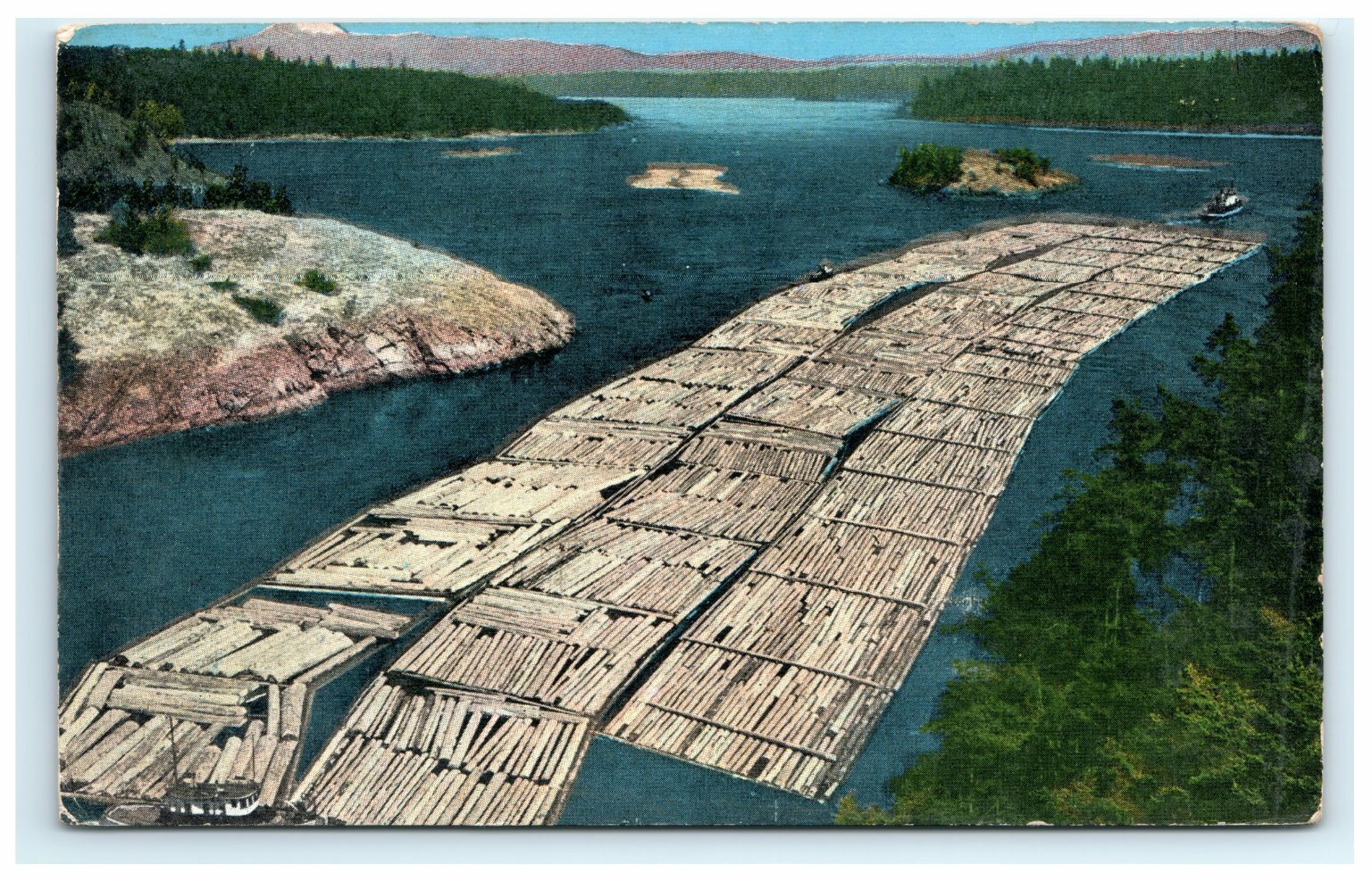 Vintage Wooden Log Boom Passing Deception Pass WA Postcard