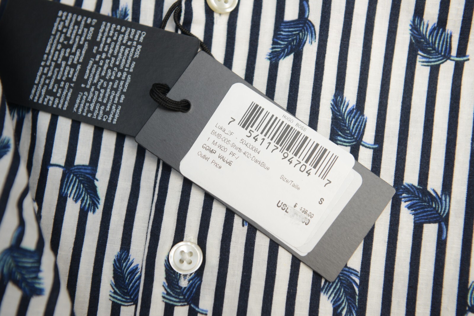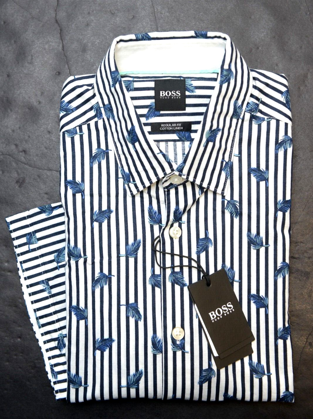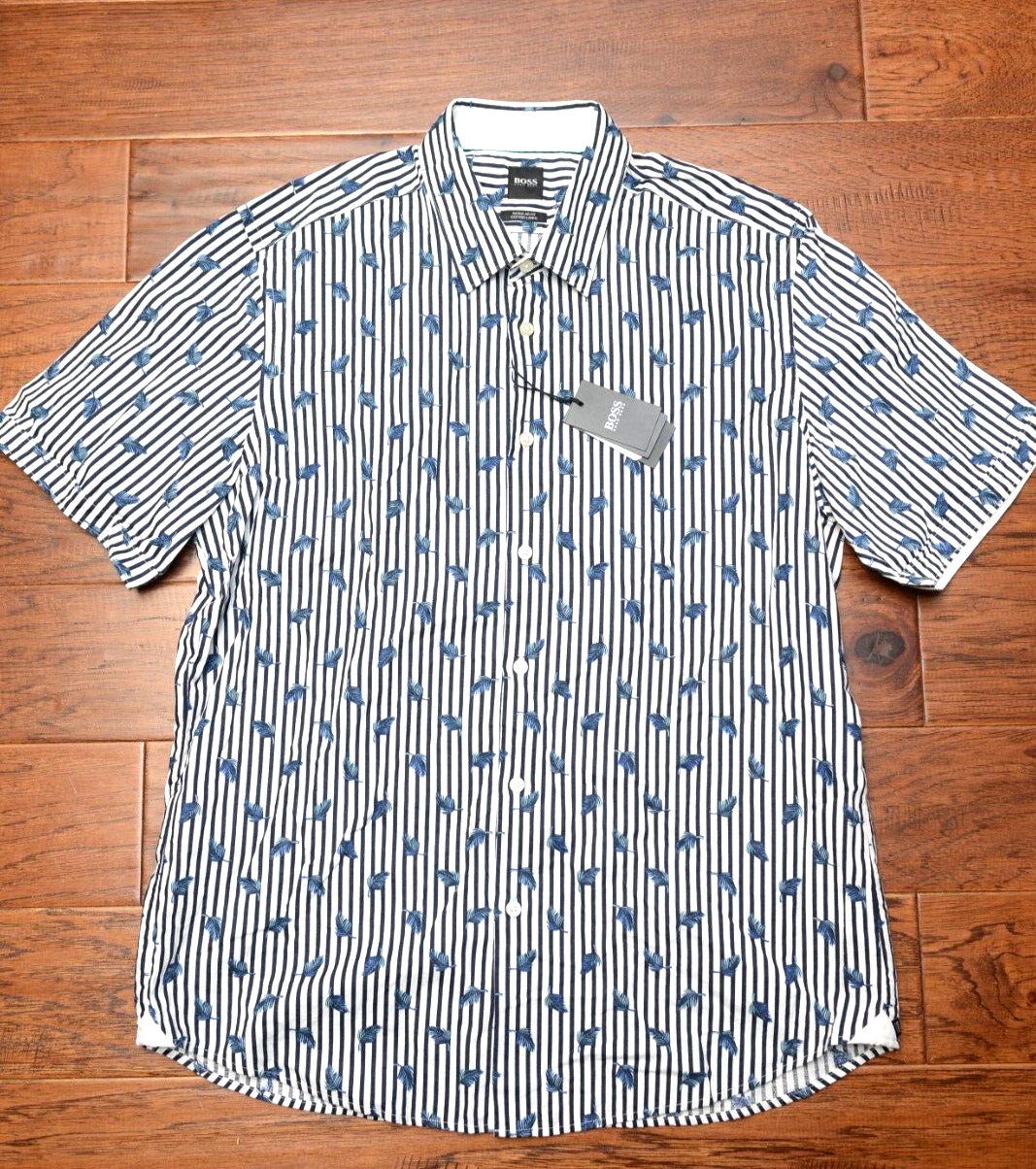 NWT Hugo -Chef Mens Luka Kurzarmel regularer Federfeder -Druck Baumwolle/Leinenhemd