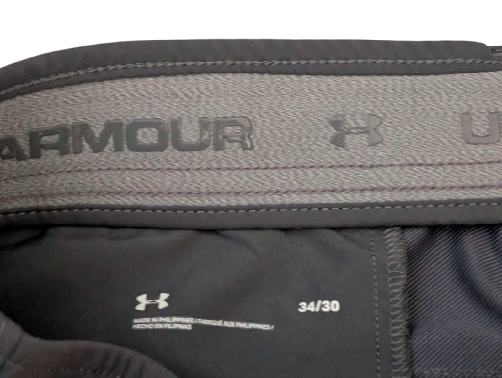 Brand new with tags! These are men's Under armor lightweight golf/athletic pants. Size 34/30. Dark charcoal gray. They are brand new with tags but as you can see from the close up picture the tag does have a little bit of water damage. Pants are brand new!