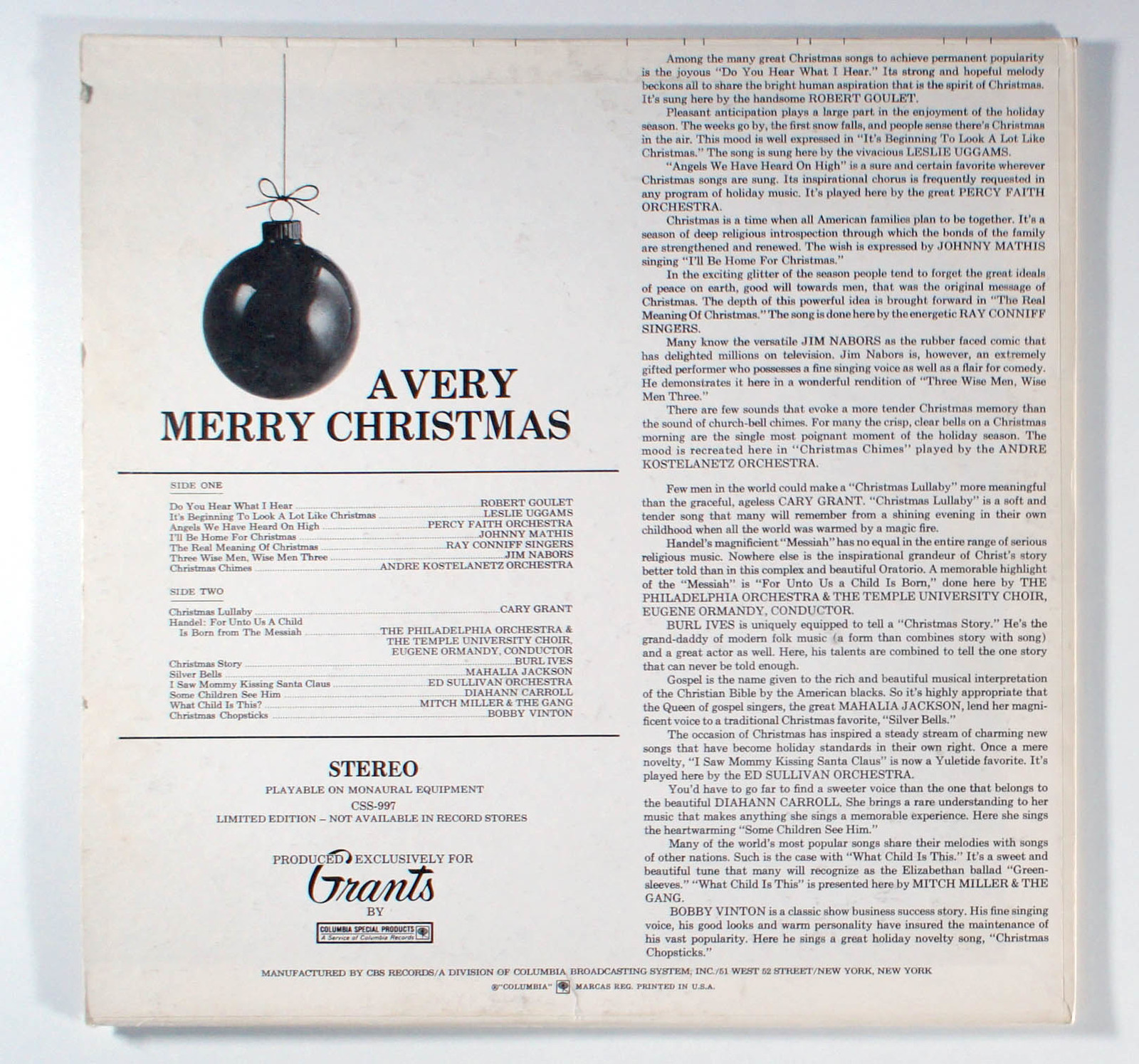 A Very Merry Christmas, Volume 3 was created exclusively for Grants and contains specially-selected Christmas favorites, featuring 15 selections to enrich your holiday. A pleasing blend of the great music of the season, the old and the new...Christmas is a holy time and a happy time. A time to reflect both the reverence and the gaiety of the season. This album which brings you the most of the best, old and new, takes the better part of a year to select talent and material, and to record. You'll be proud to add this album as part of your holiday celebration, along with millions of other families' Christmas custom."