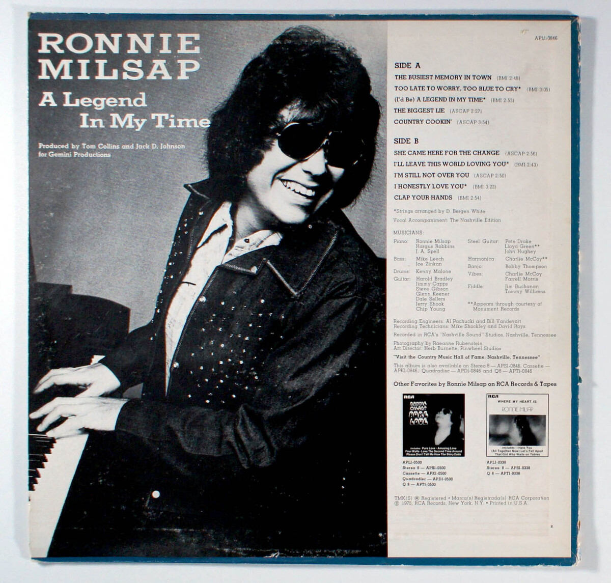 A Legend in My Time, by Ronnie Milsap, features two singles, including the Don Gibson penned (I'd Be) A Legend in My Time, which reached No. 1 on country charts and Al Dexter's Too Late to Worry, Too Blue to Cry, which peaked at No. 6. The album reached No. 4 on Country charts and made its debut on the Billboard 200 chart, peaking at No. 138. Allmusic stated that the tempo was "switched up" "a little" from the previous album, marking it as having a bit more "variety." In 1975, it was named as the Country Music Association's Album of the Year.