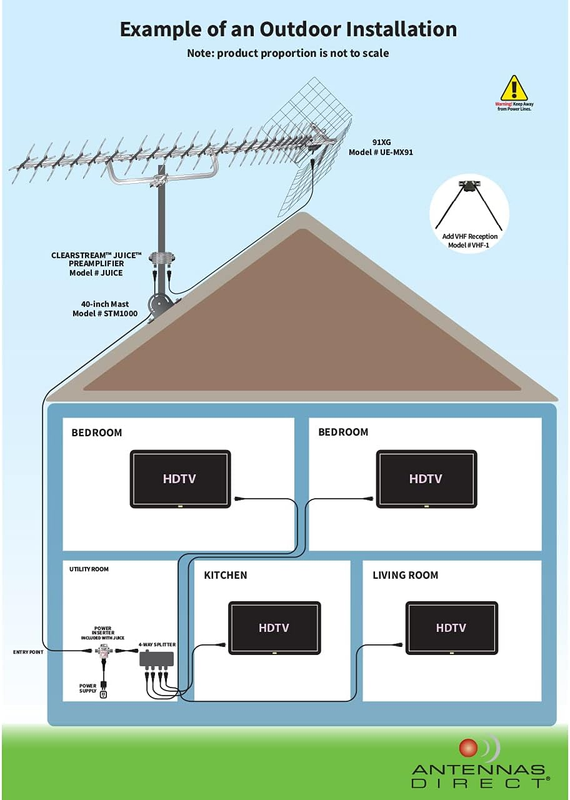 Powerful antenna measures 22" H x 24" W x 93" D; includes all-weather mounting hardware for installation on an existing outdoor mast or in an attic; ideal for rural and suburban areas