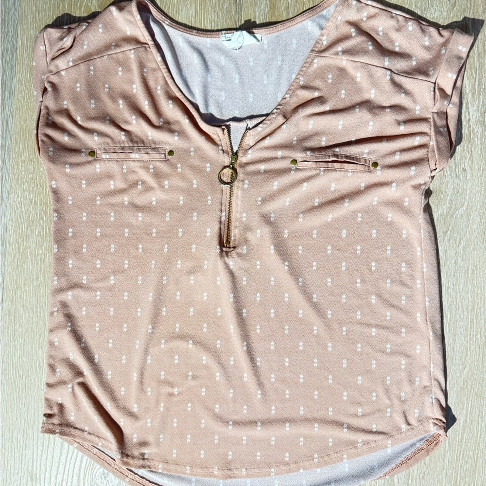 This stylish blouse from Flower Feather features a soft peach tone with delicate white print. A gold-tone zipper with a ring pull adds a modern touch, while faux pocket details and a flattering high-low hem complete the look. Ideal for casual or business-casual wear.