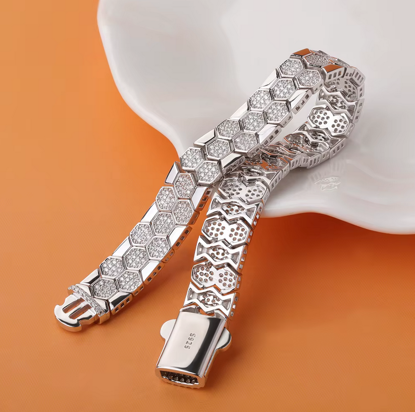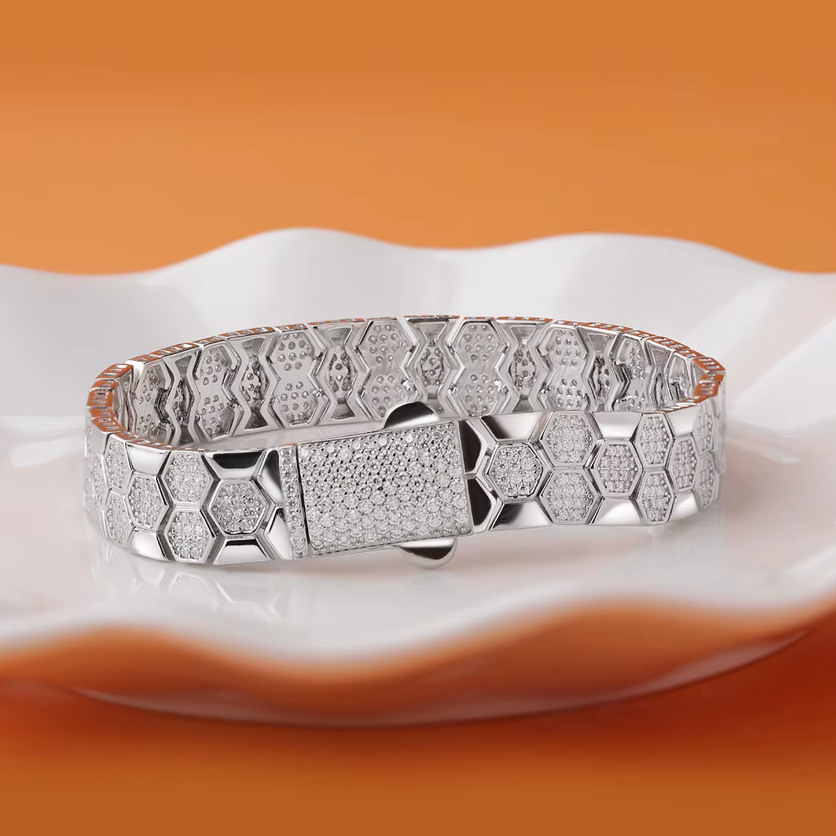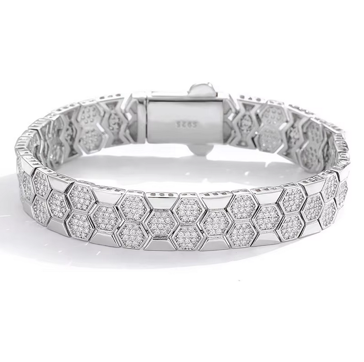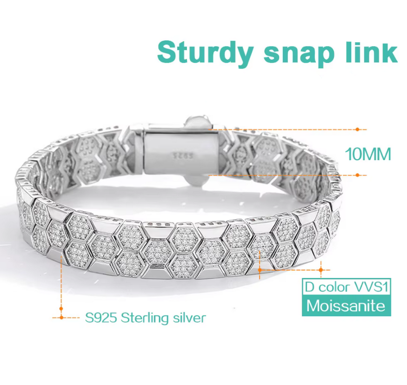 Unisex 18K 925 Sterling Silver 10*mm Full Moissanite Honeycomb Design Bracelet