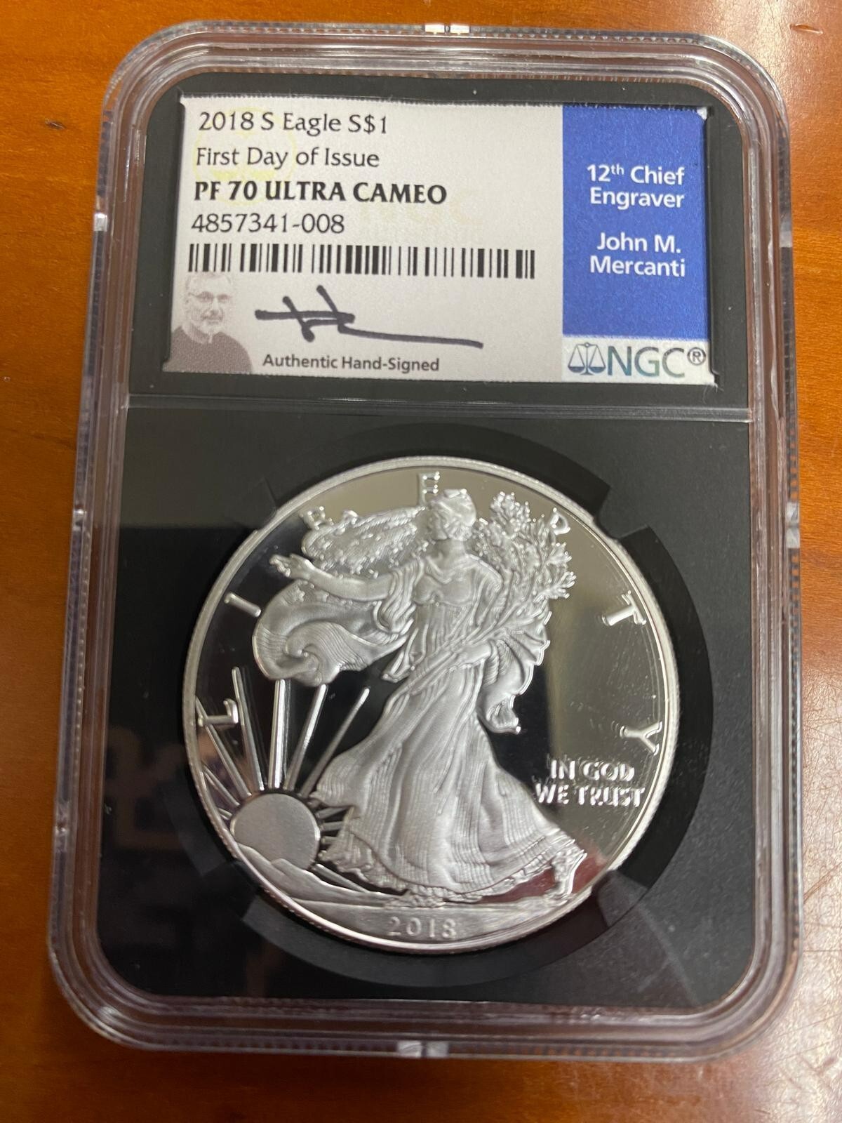 2018-S S$1 American Silver Eagle NGC PF70 Ultra Cameo FDOI Mercanti Signed