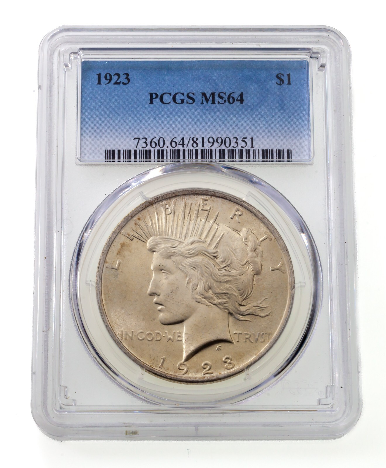 1923 S $ 1 Silber Friedensdollar von PCGs als MS-64 bewertet