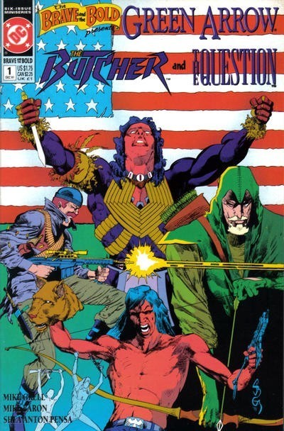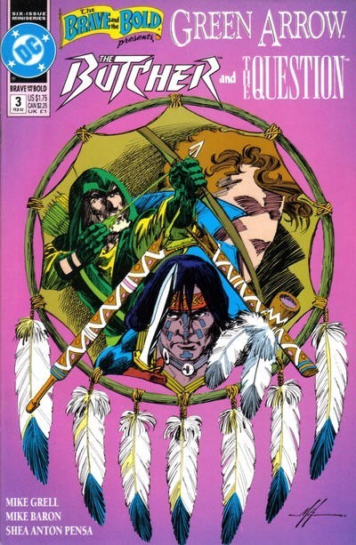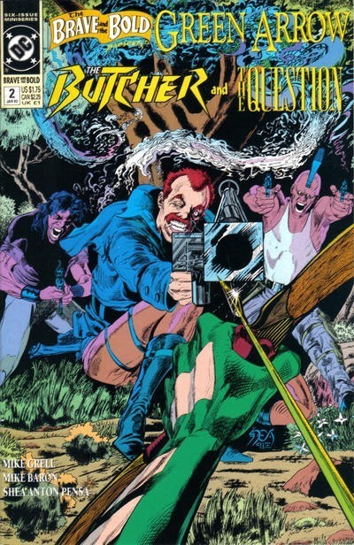 *n the good old days, the title THE BRAVE AND THE BOLD stood for the best in team-up action and adventure. Those days are back again as DC Comics revives the original team-up title for a 6-issue miniseries starring Green Arrow, the Butcher, Black Canary and the Question! In the forests of the Pacific Northwest, Green Arrow uncovers a strange alliance of American Indians and Irish terrorists. In Seattle, Black Canary looks into a scalping murder of a lumber industry executive. John Butcher infiltrates an Amerind terrorist group...and Vic Sage, the Question, has questions about everything that's happening! Written by Mike Grell and Mike Baron, with art and cover by Shea Anton Pensa.
