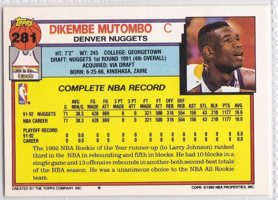 M) 1992-93 Topps Basketball Trading Card - Dikembe Mutombo #281