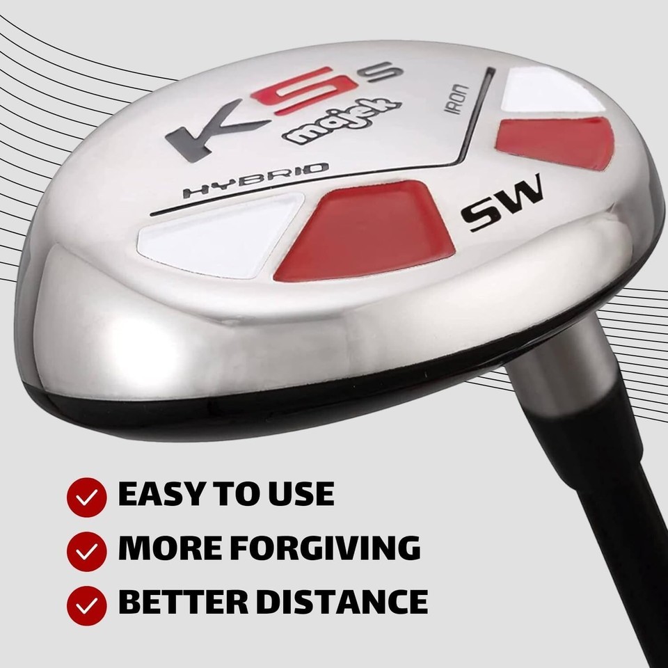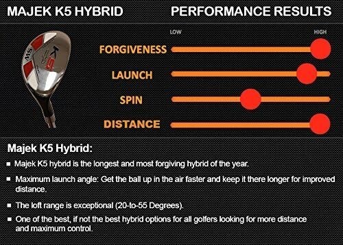 Replace Your Entire Difficult To Use Iron Set With The Majek K5 All Hybrid Iron Majekally Improve Your Hybrid-Iron Game!!! Pure Golf Engineering: Majek Hybrid was Co-Engineered by members of an elite engineering group. This unique relationship and pure engineering approach created the Majek All Hybrid Iron. Benefits of the Majek Hybrid: -More Weight Positioned Behind The "Sweet Spot" -Deeper Cavity Back Creates A Tighter Shot Dispersion, Which Increases The Accuracy On Off Center Hits. -Aerodynamic Design Creates A Reduction In Drag, Which Leads To Higher Club Head Speeds -Wide To Thin Crown Design Creates A Lower CG To Promote Higher Launch Angle For More Distance -Lightweight Premium Graphite Shaft Promotes Faster Swing Speed For Greater Distance. -Black Crown And Arrow Markers Make Alignment Easy And Eliminates Glare. Support A Local Company: Your Custom Made Majek Golf Hybrid Is Assembled By Hand In Riverside, CA, USA And Delivered Direct To Your Door.