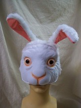 Adult 2 piece White Rabbit Mask Headpiece. Lightweight Molded plastic Costume Mask. Not a full mask more like a shield. Front of mask has a velvety feel to it. The corner of one eye has some slight excess glue or paint. (I have more than one so they might not all be like that). Mesh one sides of nose. Mask attaches to the top white plush headpiece with three velcro tabs. The headpiece has ears that are wired so they are poseable. They ears look like they are on backwards to me but maybe that's how they are supposed to be. They can be adjusted so the centers face the front. The centers of ears are a peach like color. The top part with the ears could be worn by itself but the velcro tabs would be visible. One Size Fits Most Adults. Ages 14 and up.
