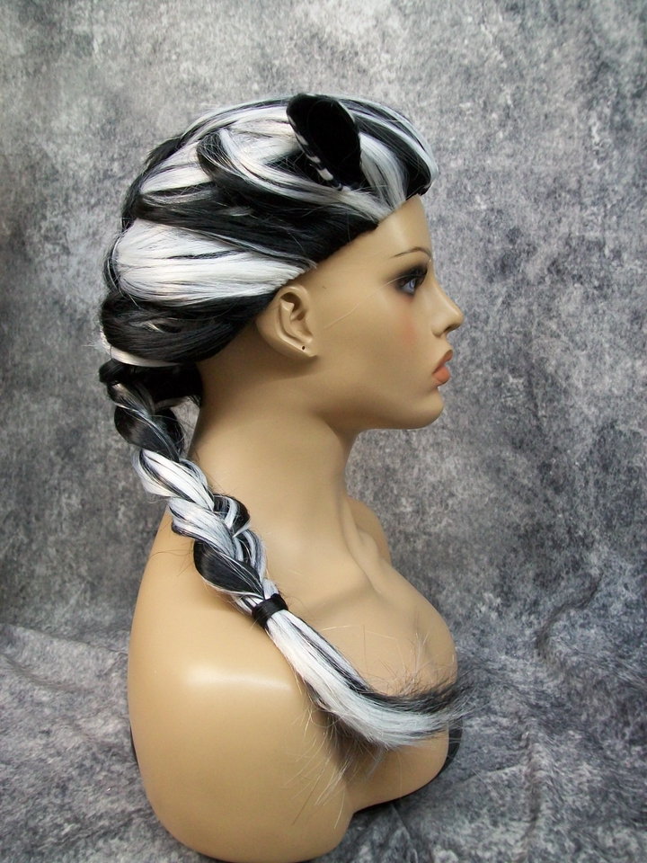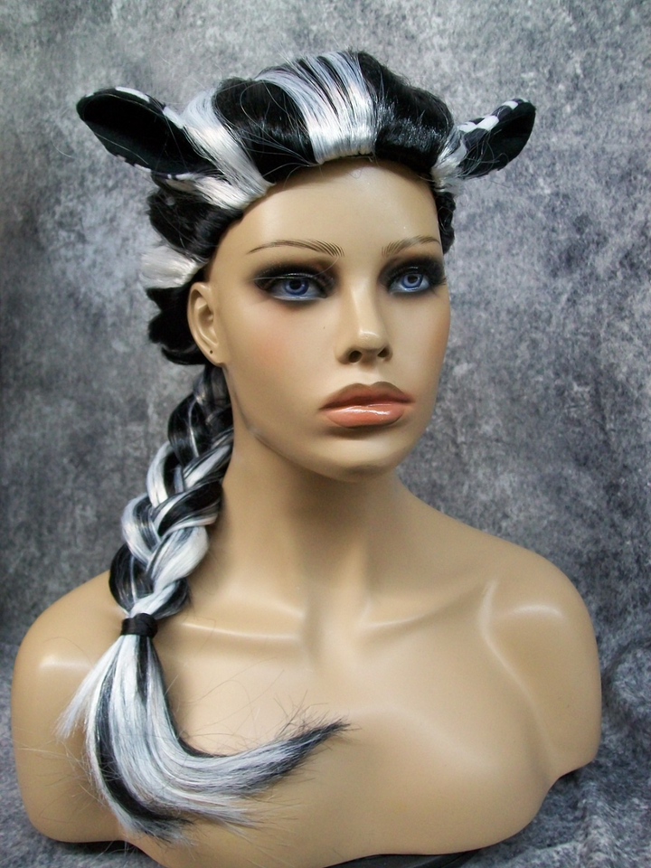Loose Braided style wig. Hair Color: Black and White. Short Frizzy filler hair in the front could be teased up to create more of a bump. Loose layered braid some shorter ends stick out of the braid here and there and will need tucked back in. Adjust fiber on the cap to conceal the net. Great accessory for a zoo animal themed Costume.