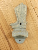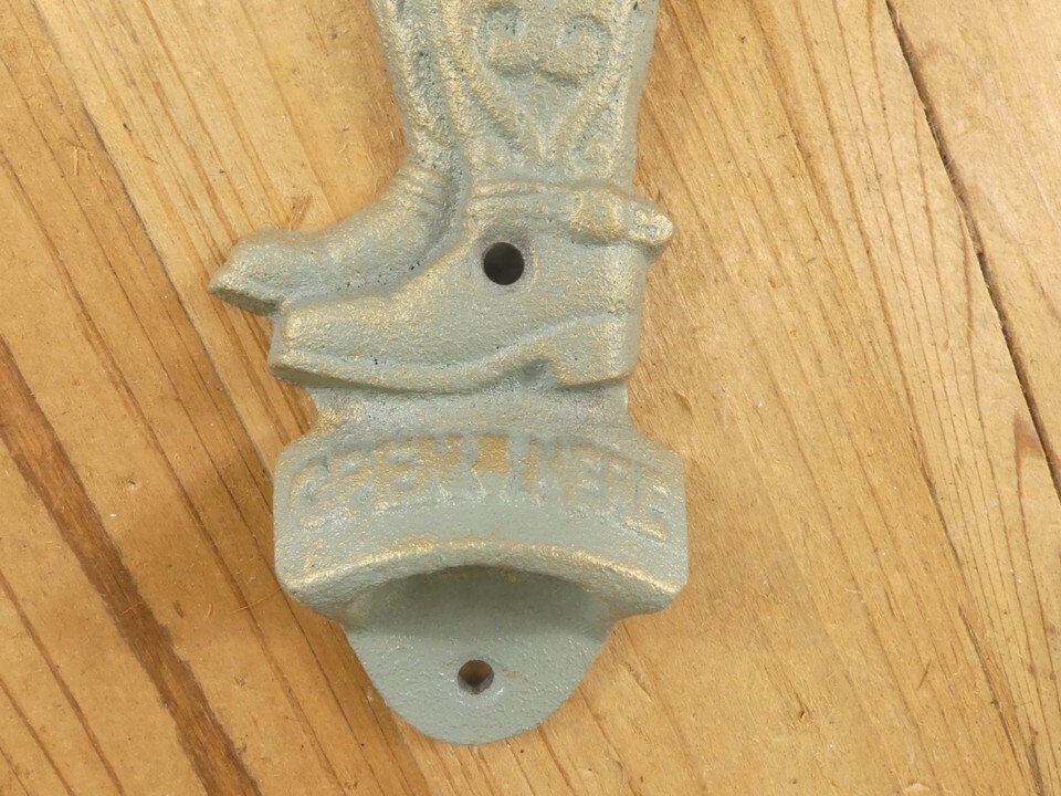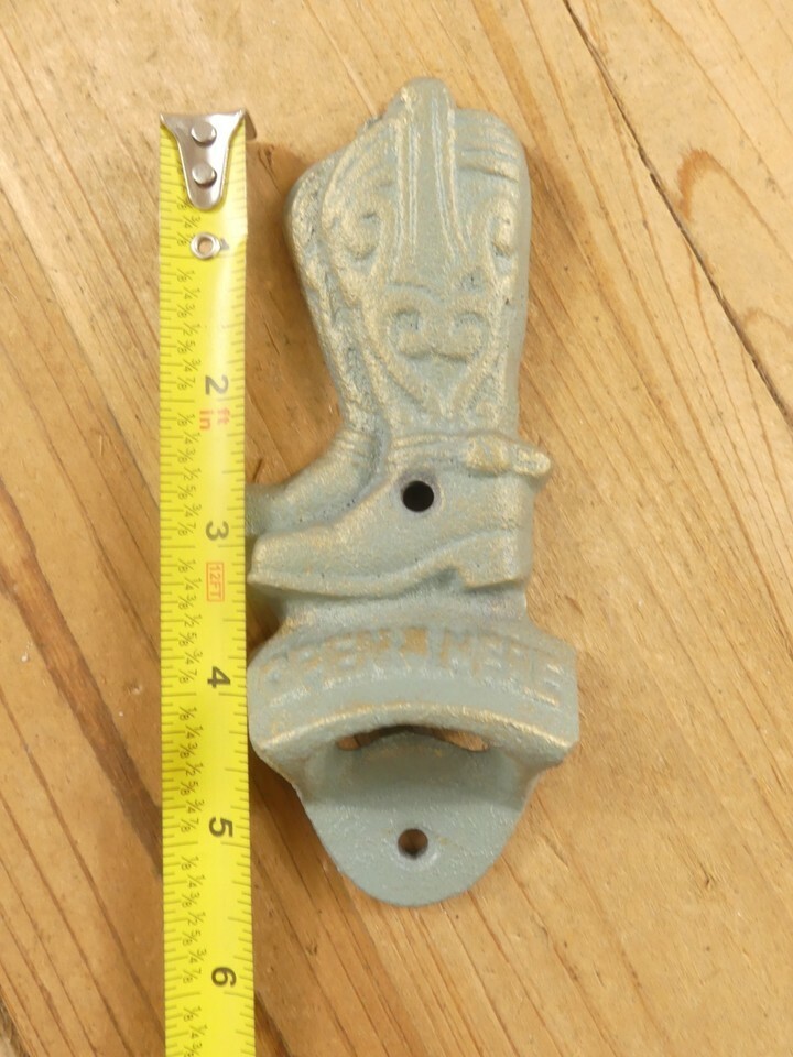 Cast Iron Cowboy Boot Beer Soda Bottle Opener Wall Mounted Green Gold Open Here