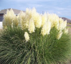 ORNAMENTAL GRASSES: Grasses provide structure and texture to your garden, offering many shapes, heights and colors. Most will ?bloom? with attractive seed fronds that move with the breeze. White Pampas Grass (Cortaderia selloana) Superb for fresh or dried arrangements! Silky White Feathers of Late-Summer Color! Fresh green foliage reaches 6 to 12 feet tall, topped by long, thick "featherdusters" of bloom that last for weeks! Unsurpassed for glorious texture and color in the landscape, this classic white Pampas Grass is the star of any garden it graces! The sturdy, fresh-green bloomstalks reach anywhere from 6 to 12 feet tall, capped by enormous snowy "featherdusters"! This ornamental grass blooms in late summer, just when the garden needs a little new color. Outstanding for fresh arrangements, the blooms are also wonderful if left to mature on the plant. They are also a mainstay of dried arrangements, offering superb vertical accent for any setting from a tall urn in the hallway to a wall display. This magnificent plant thrives in full sun and hot climates.