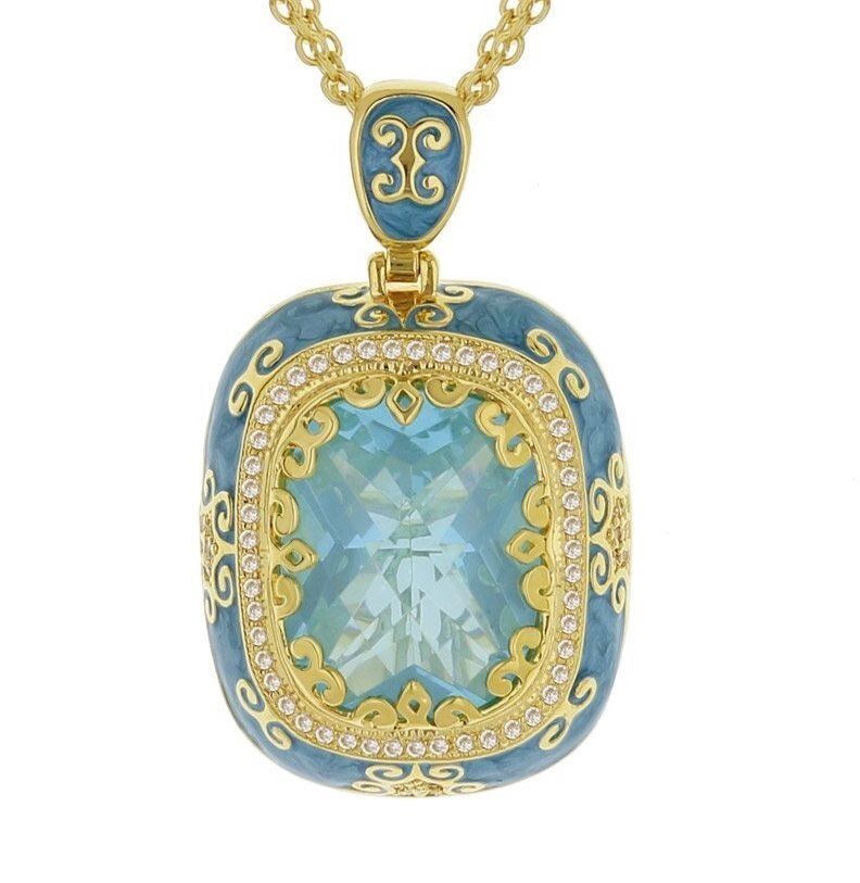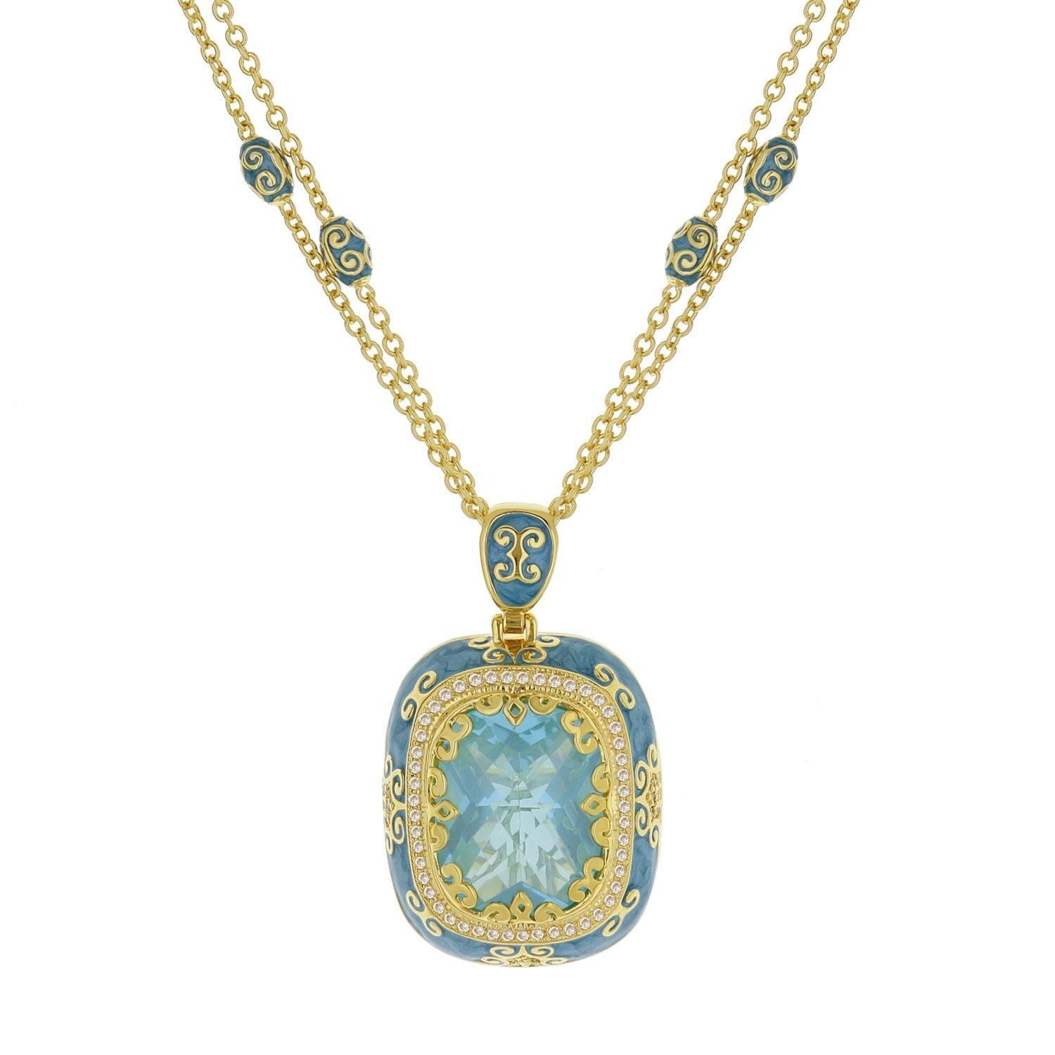 Embrace the exotic beauty of the Moroccan collection with this stunning pendant necklace. Crafted from a solid brass base and plated with 18k gold, this necklace radiates luxury and elegance. The pendant showcases exquisite hand-painted blue enamel, creating a captivating and timeless look. Cubic zirconia accents add a touch of sparkle and sophistication to the design. The necklace features a 36-inch length, making it a versatile accessory to complement a range of outfits. With its nickel and lead-free composition, this necklace prioritizes comfort and safety. Complete with a toggle clasp, this pendant necklace is both stylish and secure. Elevate your jewelry collection with this exceptional Moroccan-inspired piece. Retail price is $267.