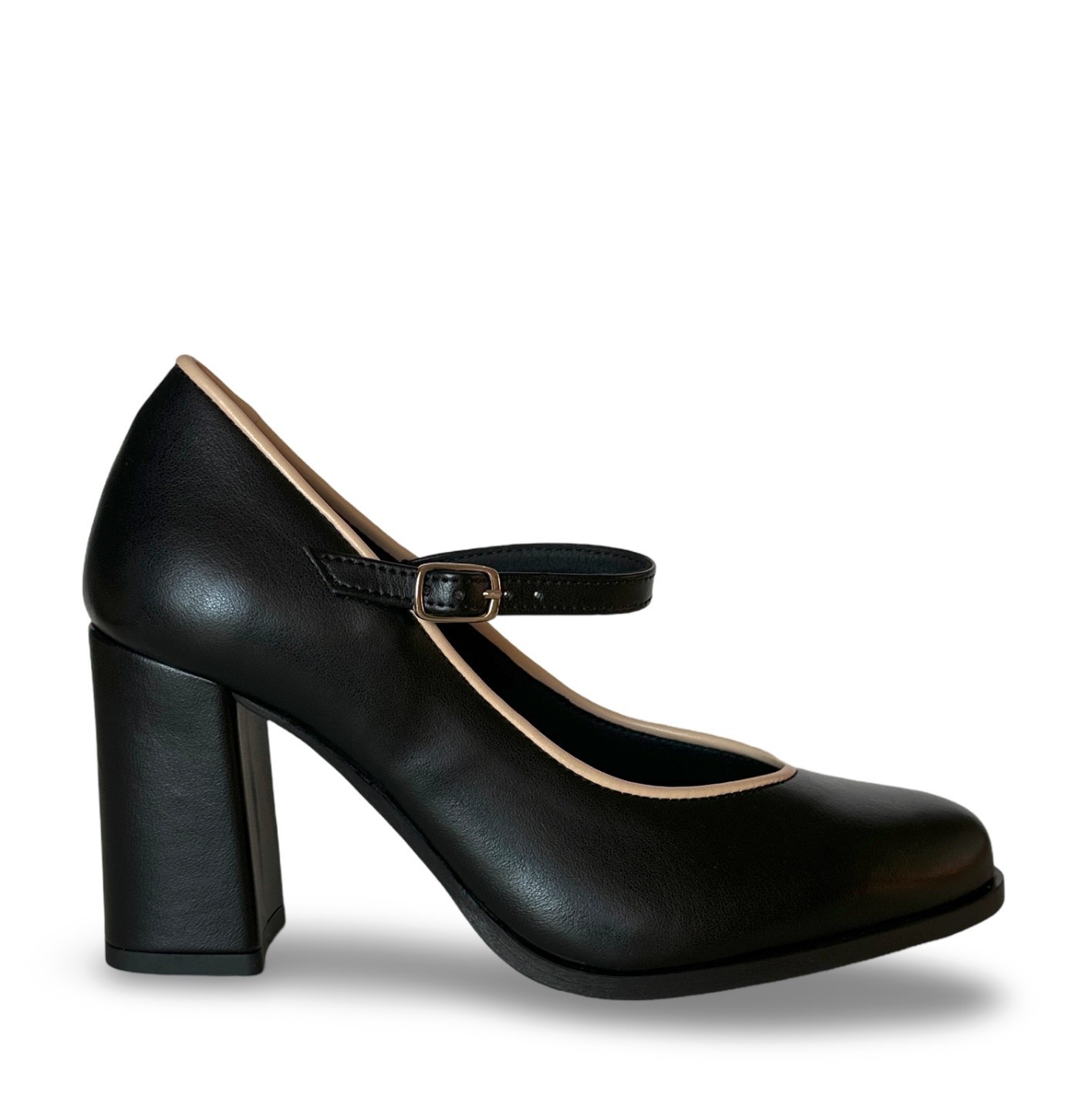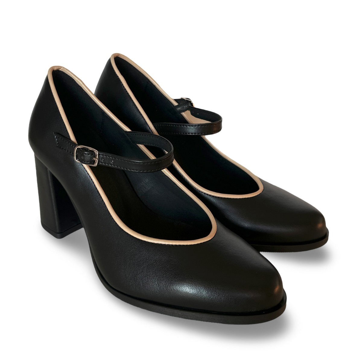 Women heels black vegan shoe buckle strap beige trim apple leather round toe