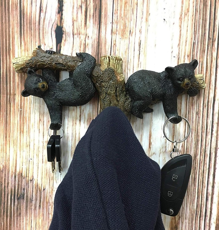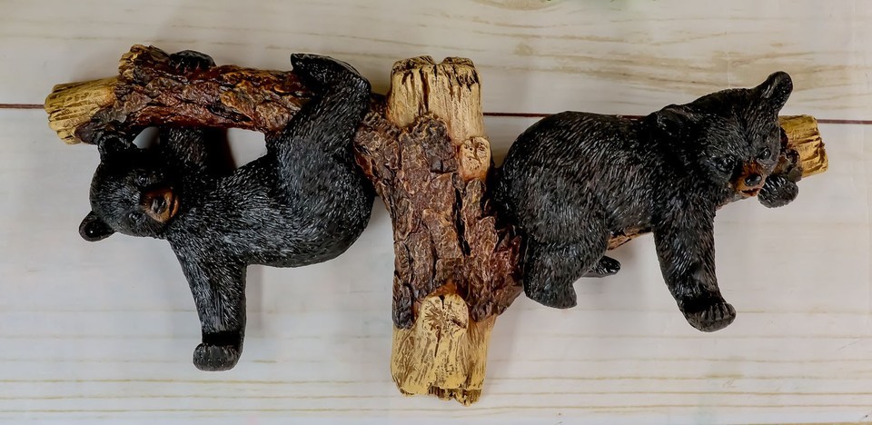 ? Two playful black bears are dangling on a tree branch in the hot summer day. They each have their arm stretched out with great mischief and who know what they might hook from animals that are passing by unaware. This bear themed wall hooks sculpture is perfect for hanging your coats, keys, hats or what have you!