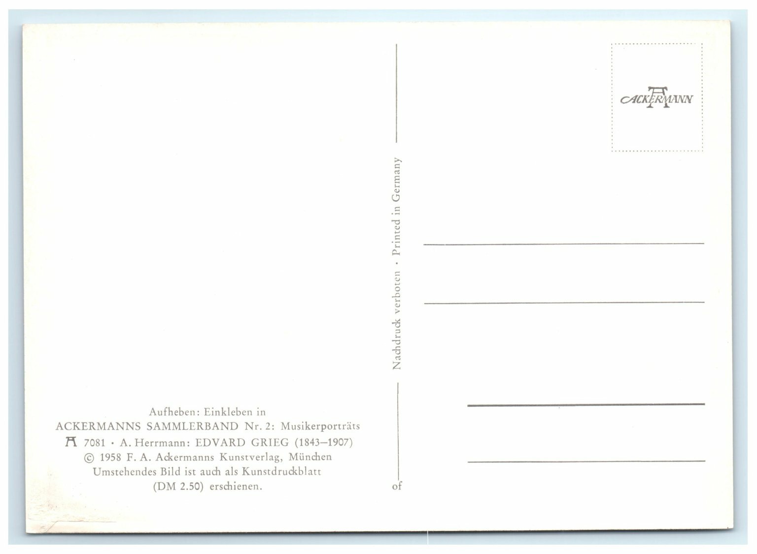 This vintage postcard features a detailed lithographic portrait of Edvard Grieg (1843-1907), the renowned Norwegian composer and pianist. Produced by the prestigious F. A. Ackermanns Kunstverlag in Munich, Germany, this postcard is part of the 'Musikerportrats' (musician portraits) series, specifically Nr. 2 in Ackermann's collector's album. The image was created by A. Herrmann and printed in 1958, showcasing classic chrome printing techniques to capture the rich tones and depth of the original artwork.