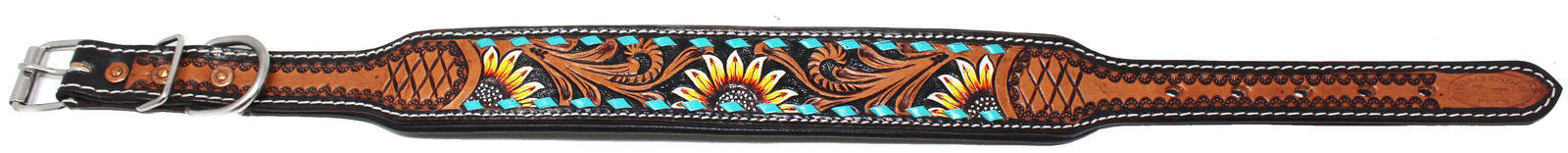 Challenger heavy-duty dog collar hand crafted from 100% genuine full grain leather and double stitched to endure everyday use. Dog collar is accented with a turquoise painted antique Vine design, with sunflowers. Soft padded back provides comfort, and helps to prevent irritation to your dogs fur or skin. Collar includes a dee-ring to easily attach identification tags or medical information. Complete with rust-free stainless steel hardware.