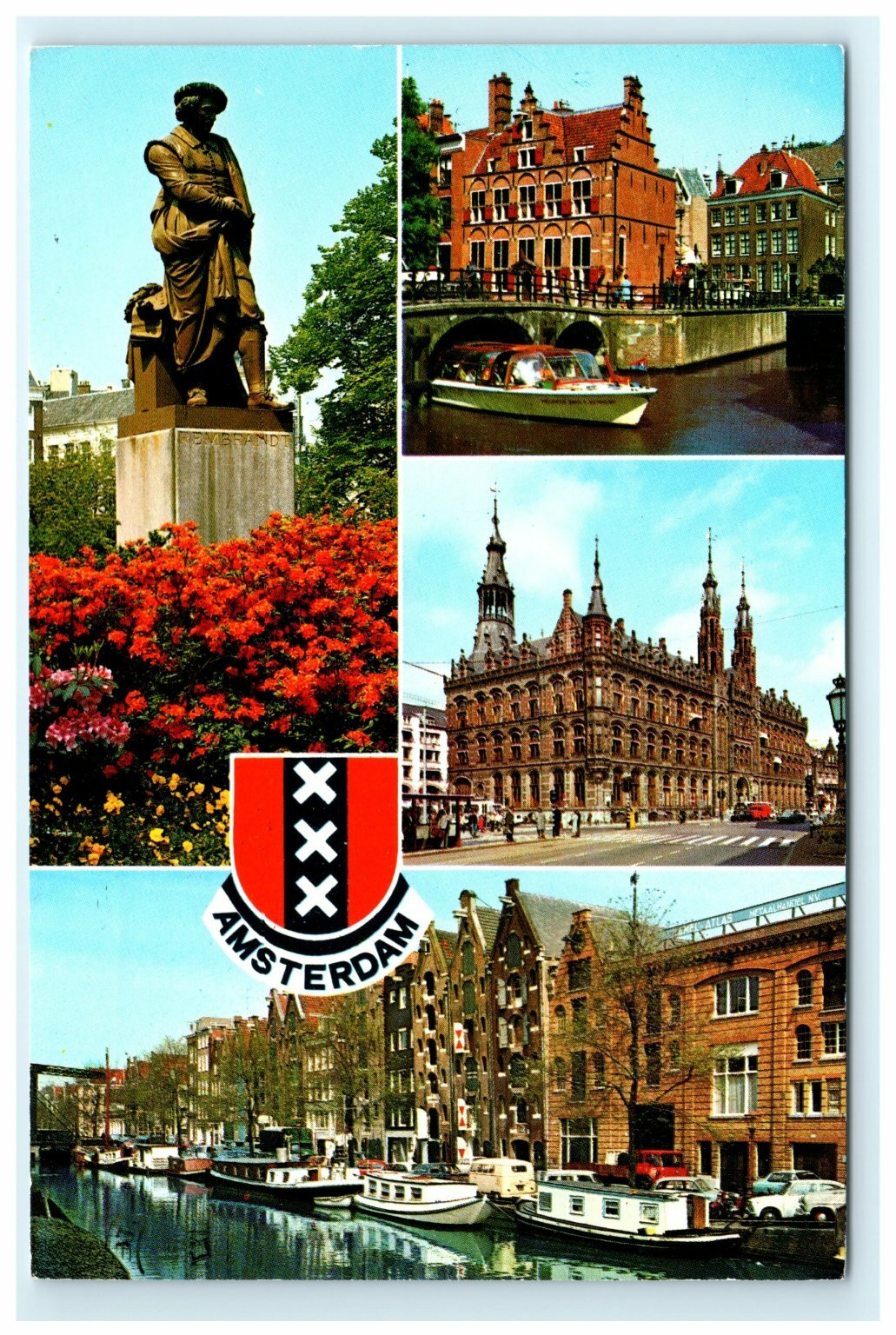 This vibrant vintage postcard features a multi-view collage of iconic Amsterdam landmarks, expertly printed as a chrome lithograph. The postcard showcases the Rembrandt statue surrounded by lush flower beds, a classic canal boat cruising under a charming bridge, the impressive neo-Gothic building of the Amsterdam Post Office, and the picturesque canal-side warehouses and houseboats that define the city's historic charm. The Amsterdam coat of arms with three vertical Saint Andrew's crosses adds a distinctive touch to the design.
