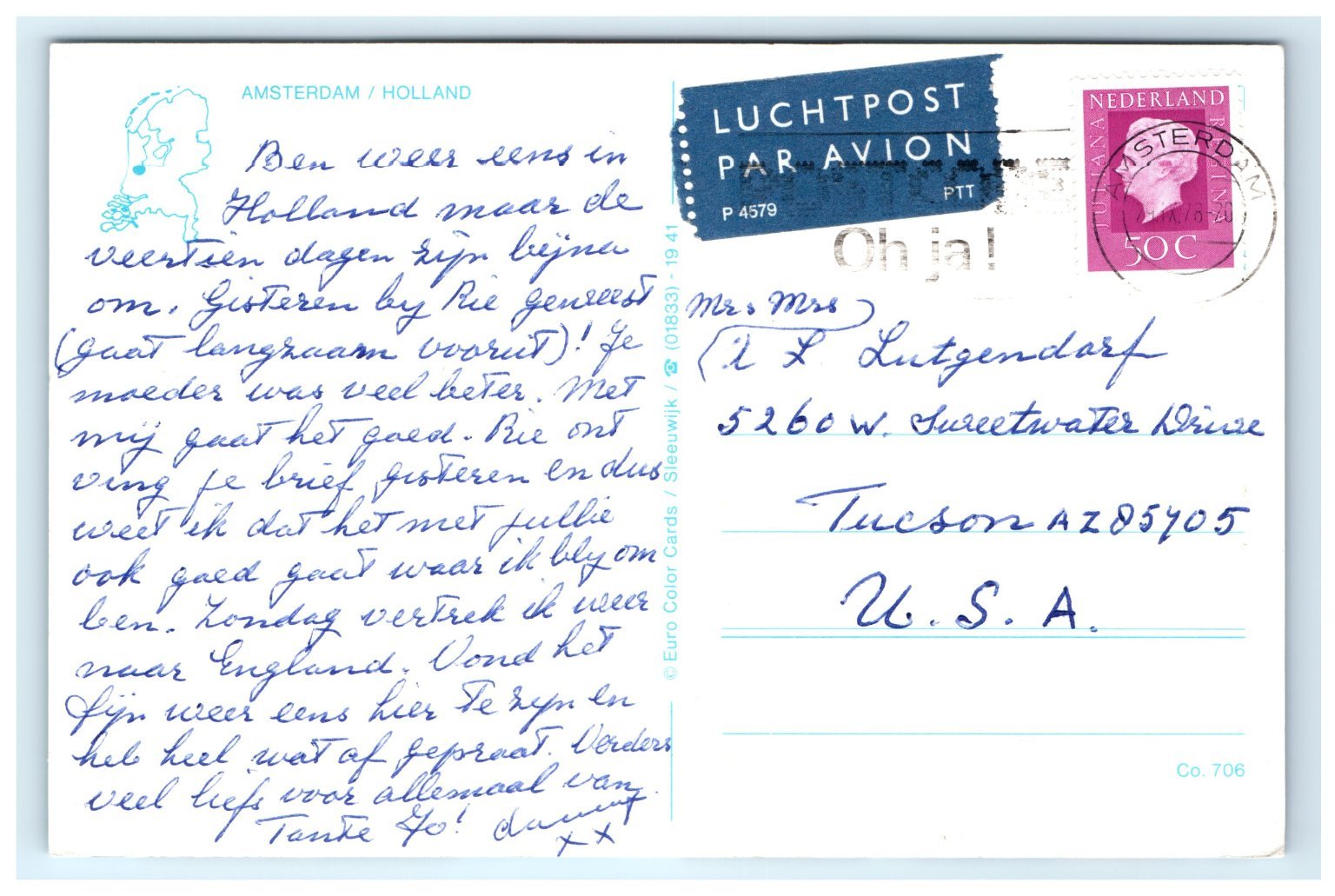 Printed on a continental (6 x 4 in) size paper, this original lithographic postcard captures the essence of Amsterdam, Holland's capital. The vivid colors and sharp details highlight the architectural beauty and waterways that make Amsterdam a world-renowned destination. The reverse side features a handwritten Dutch message, a 50-cent Netherlands stamp, and a clear Amsterdam postmark, offering a glimpse into mid-20th century travel and communication. A collectible piece perfect for postcard enthusiasts, collectors of European travel memorabilia, or anyone fascinated by Dutch culture and history.