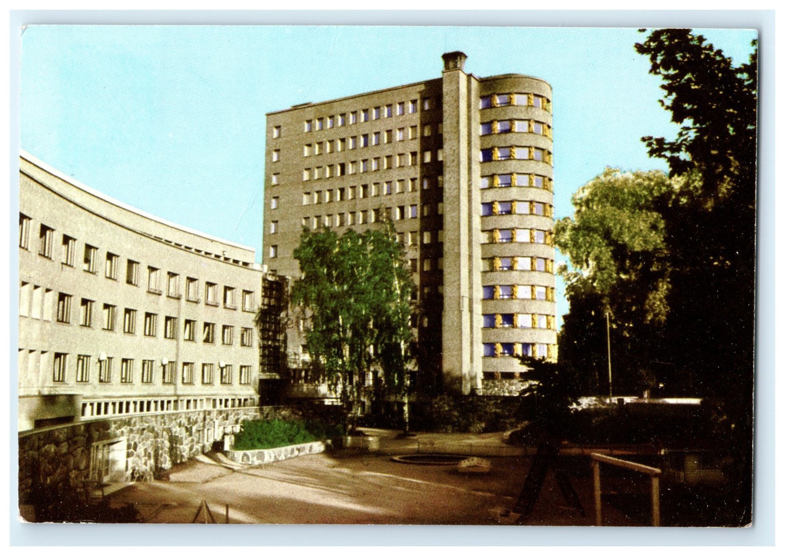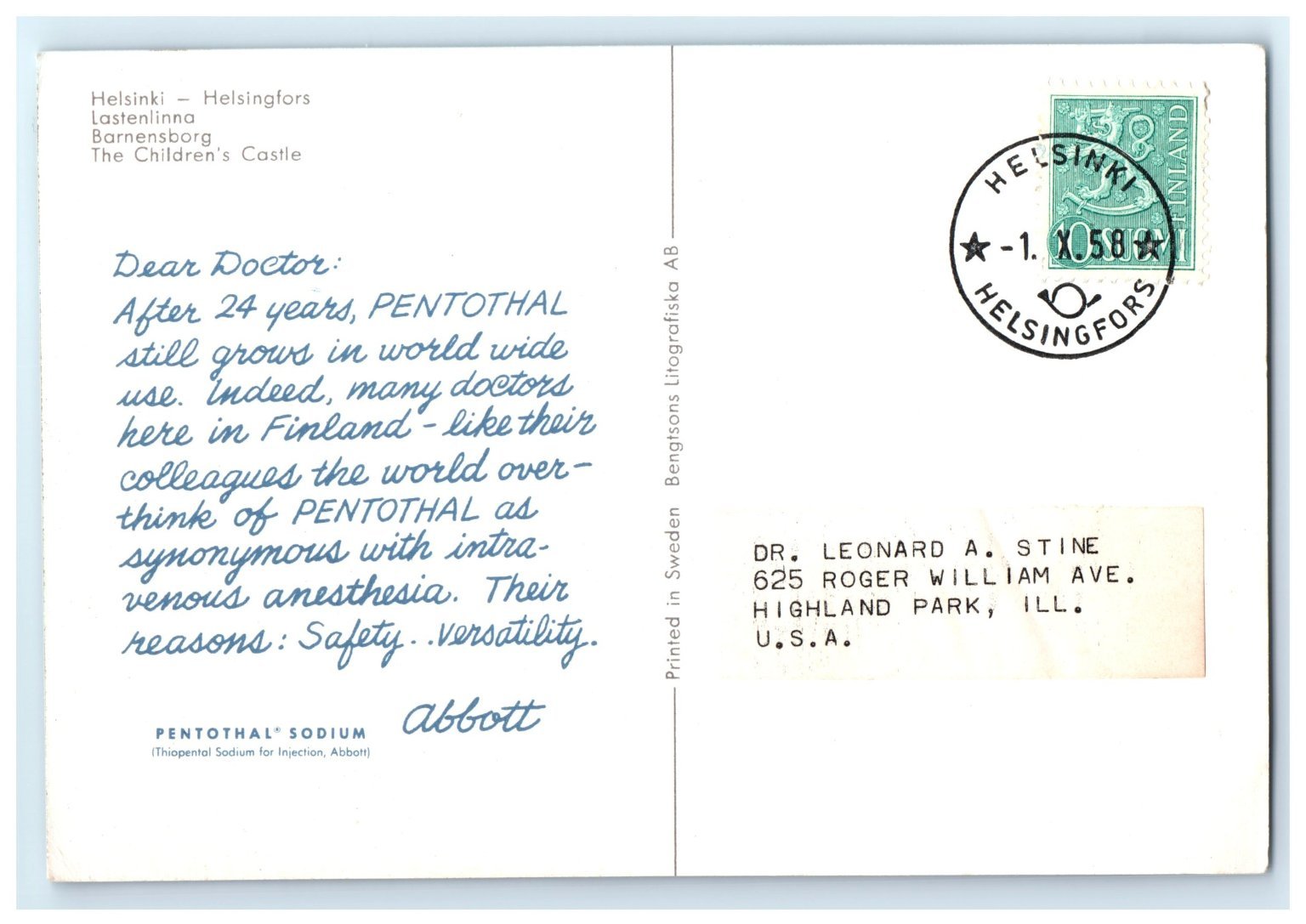 Postmarked in 1958, the card carries an authentic Finnish stamp and a personal message promoting Pentothal Sodium anesthesia, adding an intriguing historical and medical advertising element. Produced by Bengtsons Litografiska AB in Sweden, this original postcard is a collectible piece for enthusiasts of Scandinavian architecture, vintage postcards, and medical history memorabilia. Its continental size (6 x 4 inches) makes it a perfect addition to any postcard collection or for display.