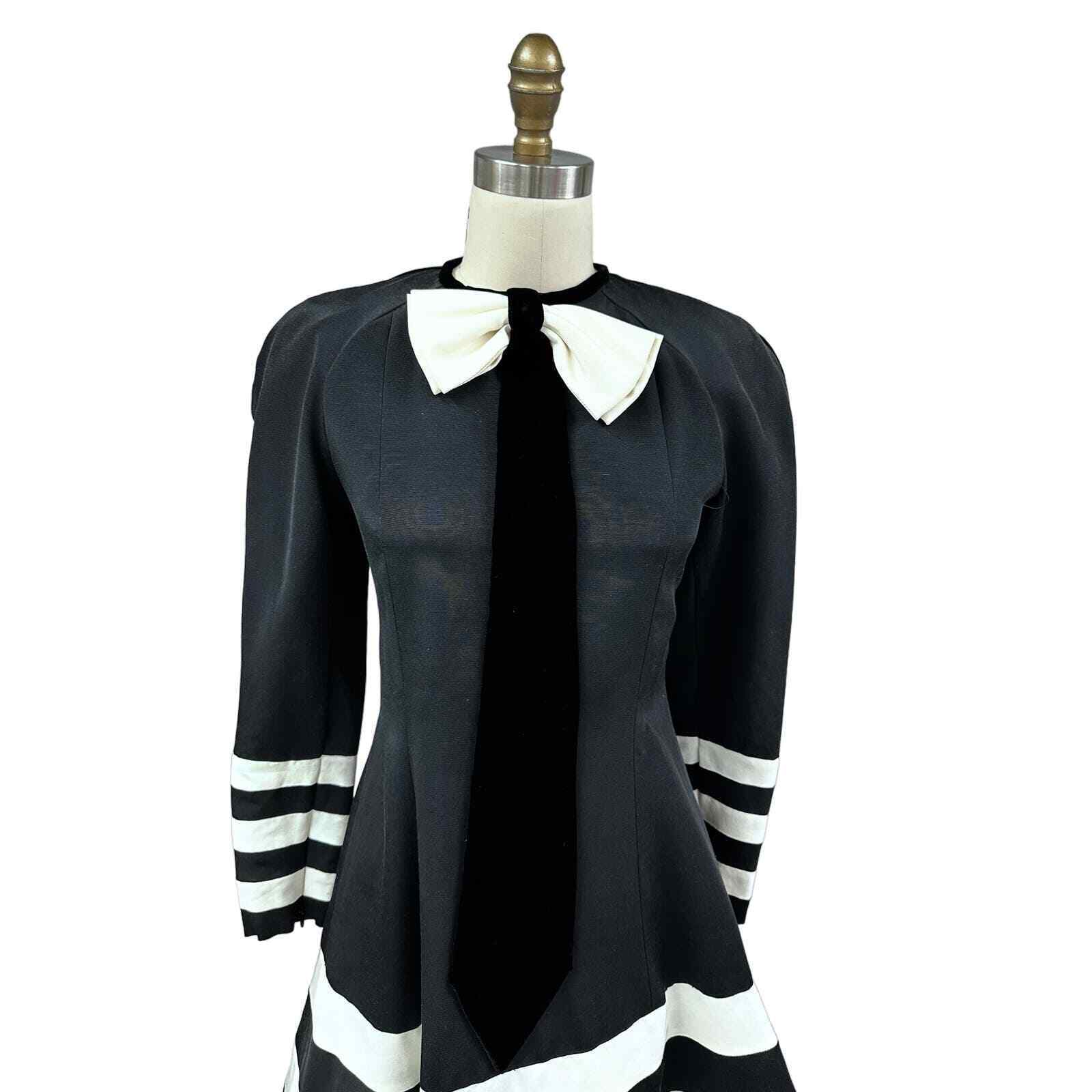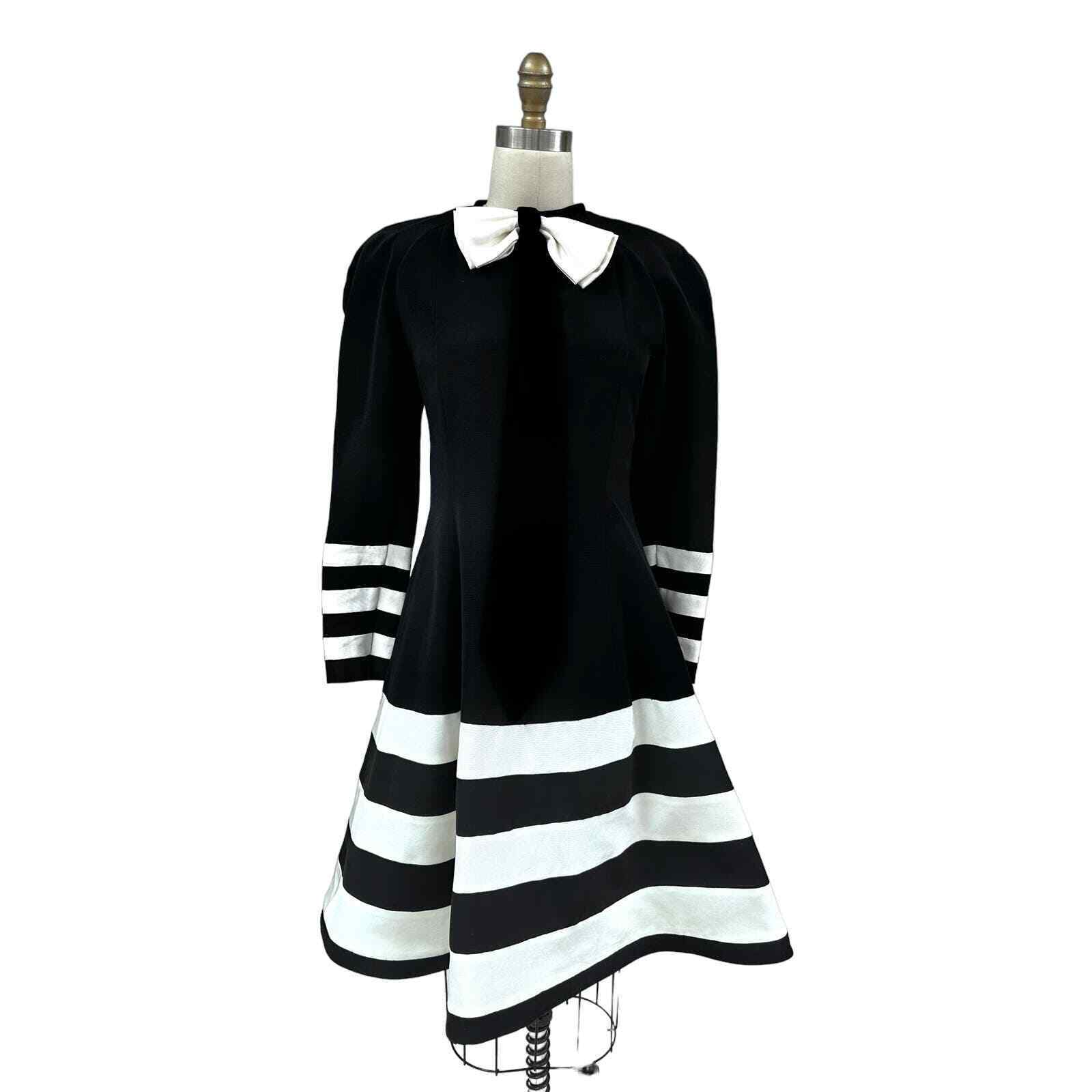 Vintage Uber 80s Blk/Wht Velvet Neck Tie Dress from Saks Fifth Avenue, Made in France, Sz 8 is marked on tag, Shoulder Pads, Nylon Zipper Back YKK Pull, Black Dress with White Stripes on Cuffs and Across Bottom. White Bow, Black Velvet tie. Style: Nature, 55% Cotton, 45% Rayon. The dress is in excellent condition, no flaws.