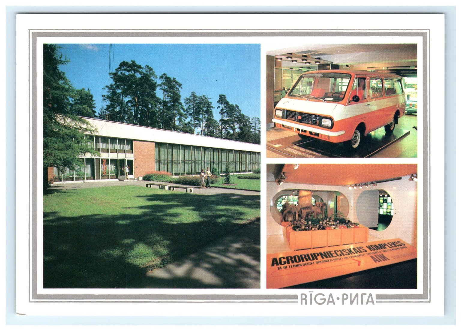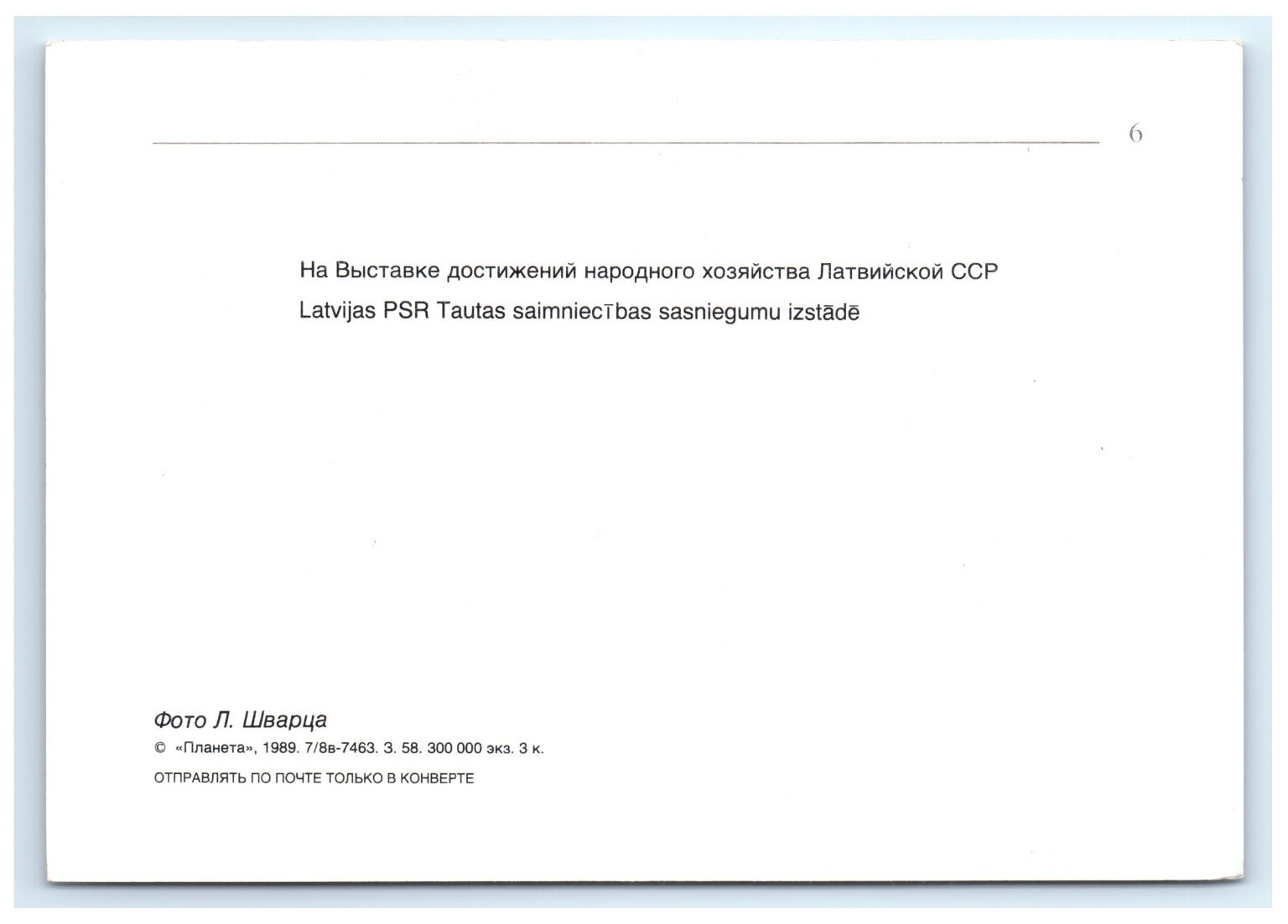 This vintage lithograph postcard from 1989 captures the Latvian SSR's Exhibition of National Economy Achievements in Riga. Featuring a modernist exhibition building surrounded by lush greenery, the card also highlights an iconic Soviet-era van and a detailed indoor agricultural display. The postcard offers a unique glimpse into Soviet Latvia's industrial and agricultural pride during the late 20th century.