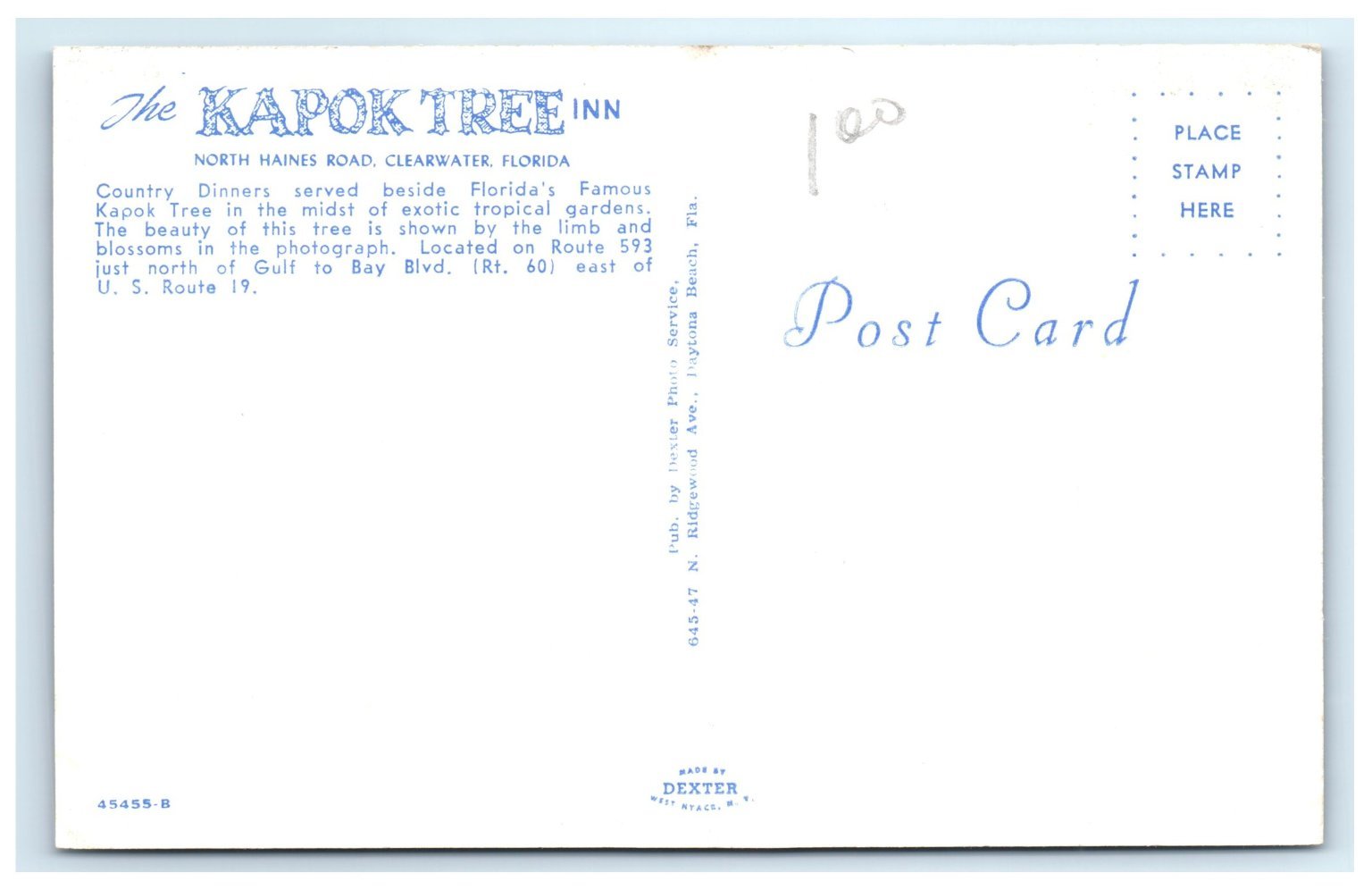 Published by Dexter Photo Service of Daytona Beach, Florida, this postcard provides a glimpse into a classic roadside attraction along North Haines Road. The back includes detailed text describing the Kapok Tree Inn location and its famous gardens along Route 593, just north of Gulf to Bay Blvd. This collectible postcard is perfect for enthusiasts of vintage Florida memorabilia, tropical botany, or nostalgic travel souvenirs.