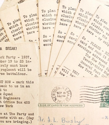 In great antique condition with typical used postcard wear. All have some kind of writing on them. For the New York City Party for the 23rd Engineer's in Times Square from Sept 19-23 in the year 1937