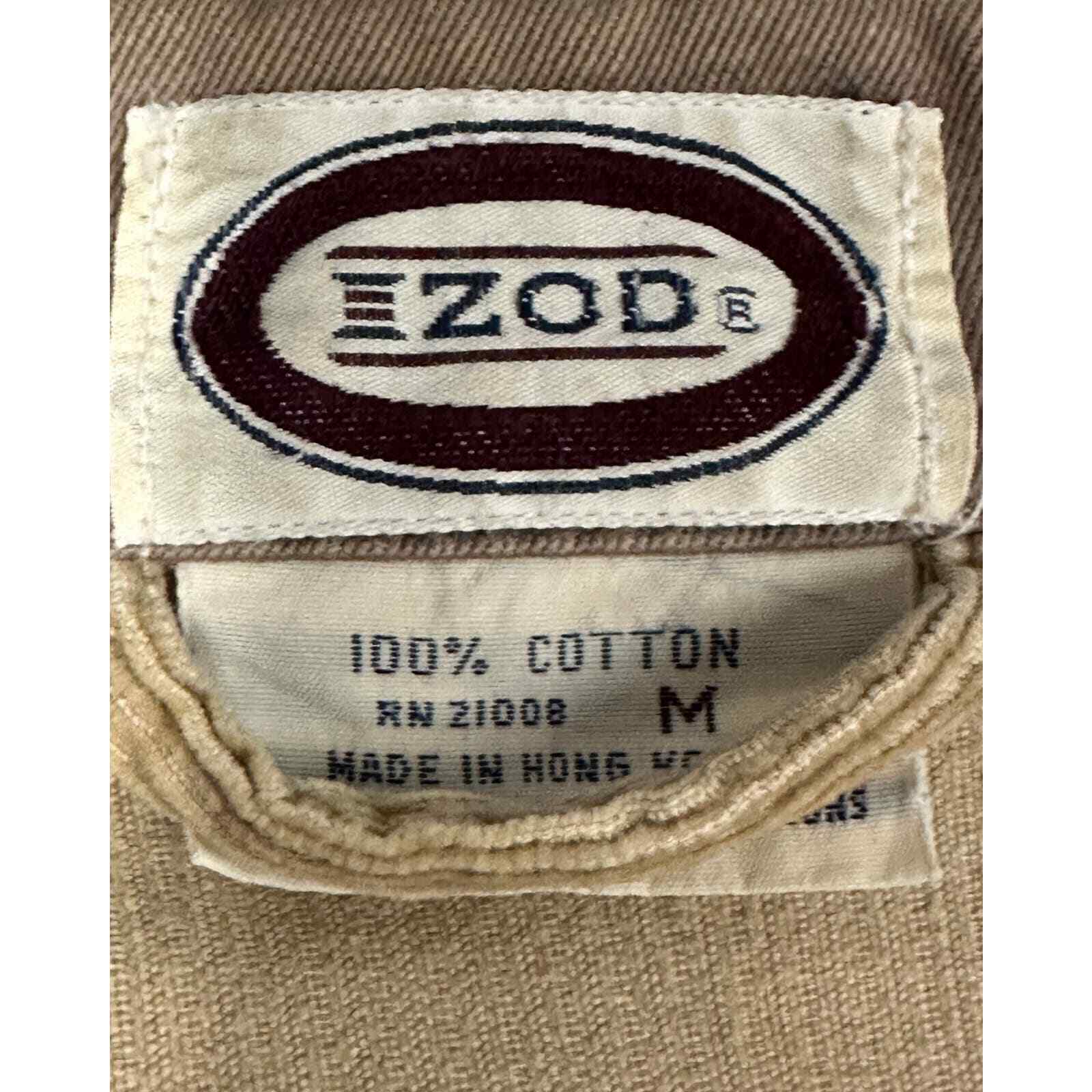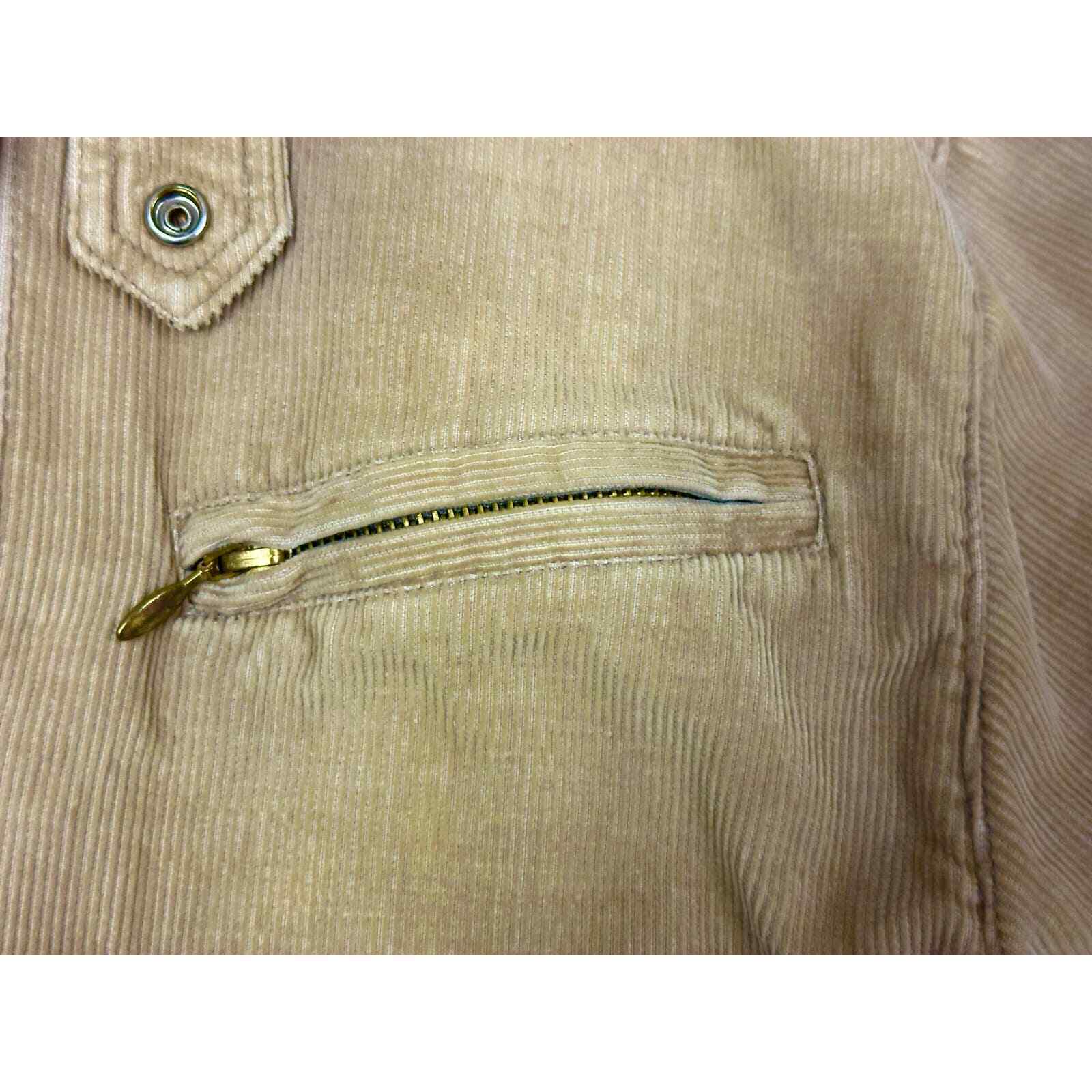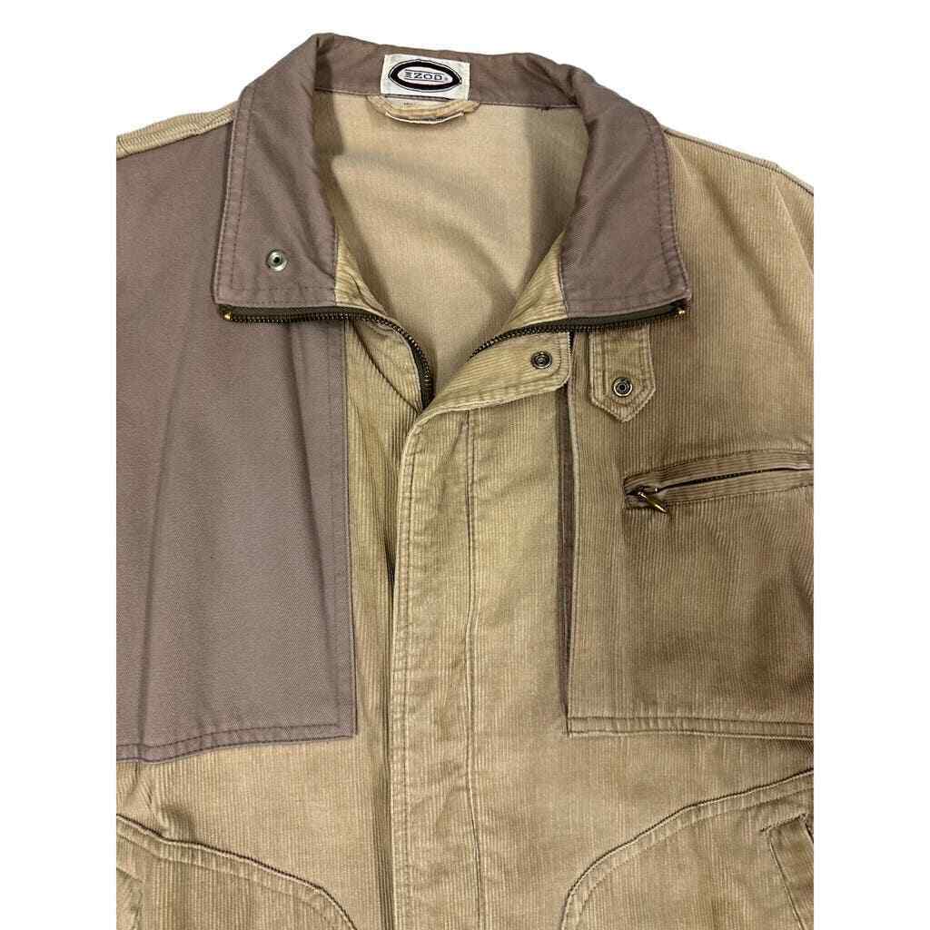 Vintage Izod Beige Corduroy Jacket Sz M RN 21008 Made in Hong Kong Metal Zipper YKK Pull 100% Cotton-2 front patch pockets that snap shut, and one zip pocket at chest. In good vintage condition. NOTE: Color is much lighter than shown.