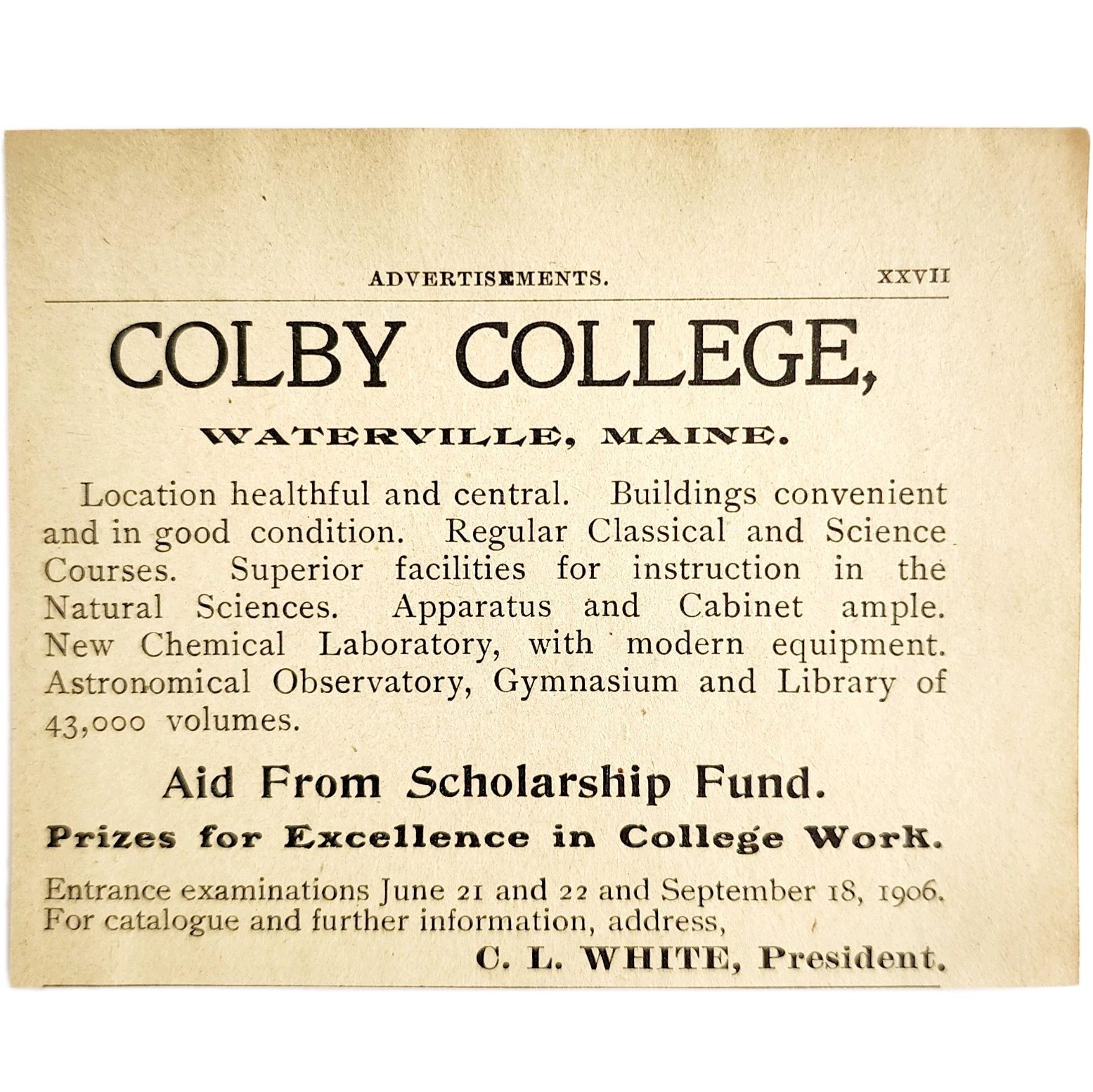 1906 Colby College C.L. White President Advertisement Waterville Maine E17E