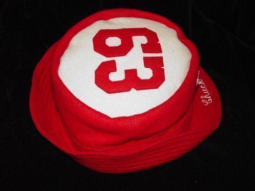 Nice cherry red felt hat with vinyl hat band, 63 is stencilled on top in felt letters. The name 'Chuck ' is chain-stitched on the brim. The label is The Standard Pennant Co. Big Run, PA. Excellent hardly used at all condition though vinyl hatband inside is somewhat dried. Inside hatband 20 1/2".