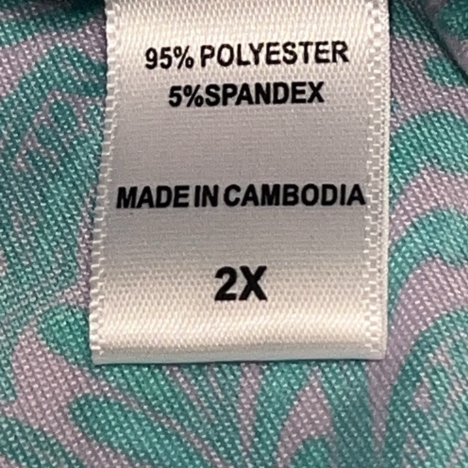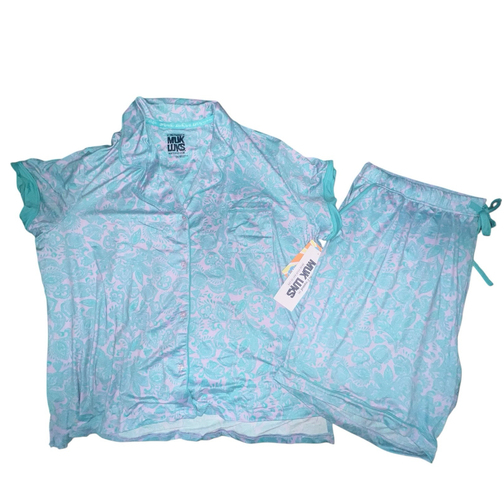 This Muk Luks pajama set for women in size 2X features a cloud knit notch collar top in a floral blue design with short sleeves. The set includes lightweight shorts and is machine washable. The garment is made of knit fabric and is ideal for sleepwear. The set is themed around beach, colorful, and classic elements.