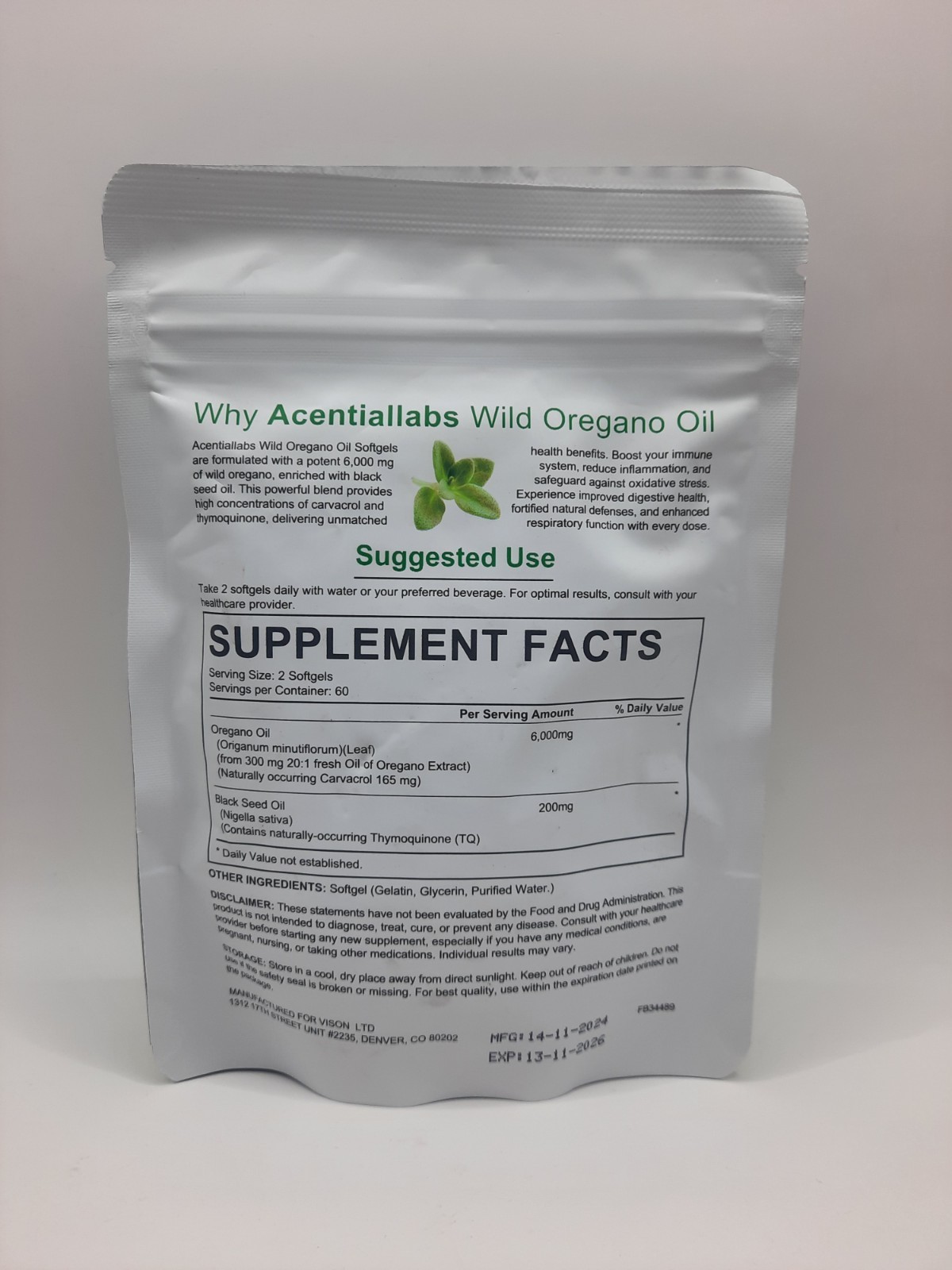 ACENTIALLABS Wild Oregano Oil 6,000mg with Black Seed Oil - 120 SG Exp 11/2026.